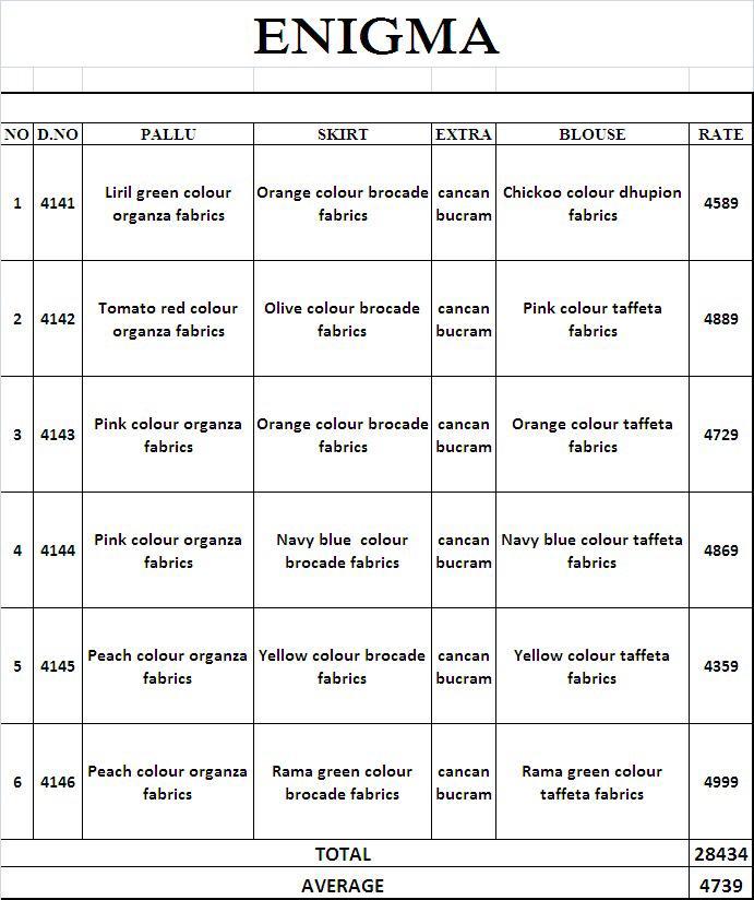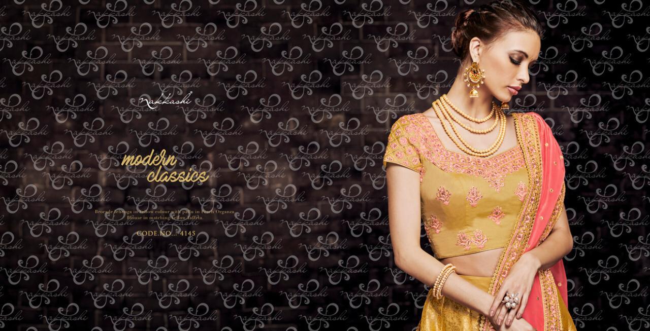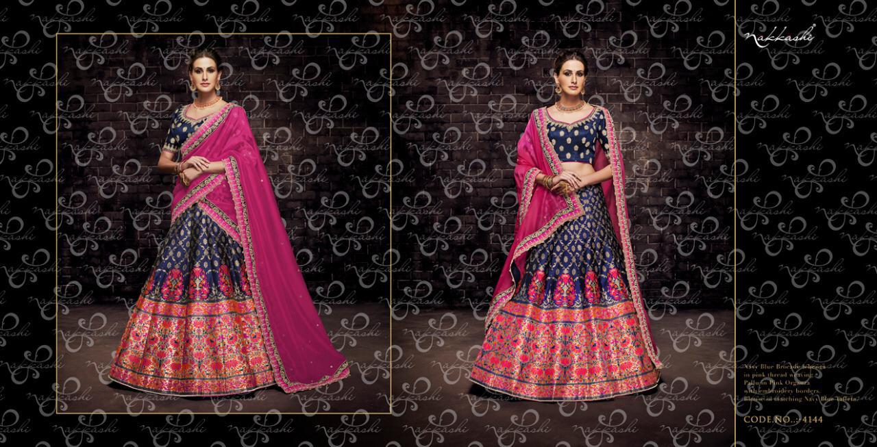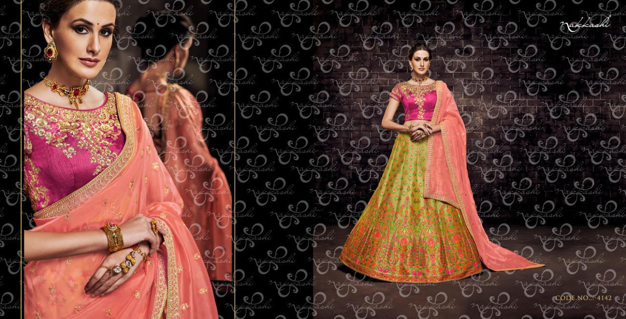 Buy Online Enigma By Nakkashi 4141 Series Designer Party Wear Silk Lehenga Collection Is Wholesale Dealer Surat 6 Pcs of Full Catalogue at Wholesale Price. Looking for Enigma By Nakkashi 4141 Series Designer Party Wear Silk Lehenga Collection Is Wholesale Dealer Surat Full Catalouge at Best Price? Buy Now Enigma By Nakkashi 4141 Series Designer Party Wear Silk Lehenga Collection Is Wholesale Dealer Surat at Wholesale Rate of Rs 28434 with Total 6 Pcs from authroized dealer and supplier of NAKKASHI Brand. Cost of Each piece is just only Rs 4739 which is very low and affordable price to resale the product in your retail store ,This is Surat based Wholesale Supplier & Dealer of NAKKASHI Brand. Click on Brand name to Know more about NAKKASHI Brand's products.Call or Whatsapp on 9898838984 for booking or enquiry