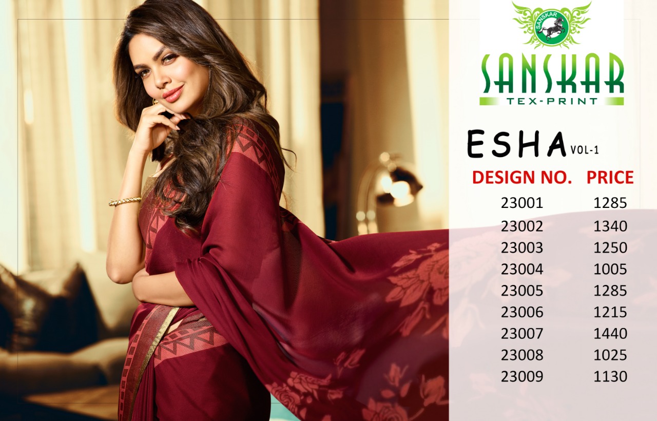 Buy Online Esha Vol 1 By Sanskar Tex Prints Series 23001 To 23009 Designer Party Wear Sarees Wholesale Supplier And Dealer Surat 9 Pcs of Full Catalogue at Wholesale Price. Looking for Esha Vol 1 By Sanskar Tex Prints Series 23001 To 23009 Designer Party Wear Sarees Wholesale Supplier And Dealer Surat Full Catalouge at Best Price? Buy Now Esha Vol 1 By Sanskar Tex Prints Series 23001 To 23009 Designer Party Wear Sarees Wholesale Supplier And Dealer Surat at Wholesale Rate of Rs 10980 with Total 9 Pcs from authroized dealer and supplier of SANSKAR Brand. Cost of Each piece is just only Rs 1220 which is very low and affordable price to resale the product in your retail store ,This is Surat based Wholesale Supplier & Dealer of SANSKAR Brand. Click on Brand name to Know more about SANSKAR Brand's products.Call or Whatsapp on 9898838984 for booking or enquiry