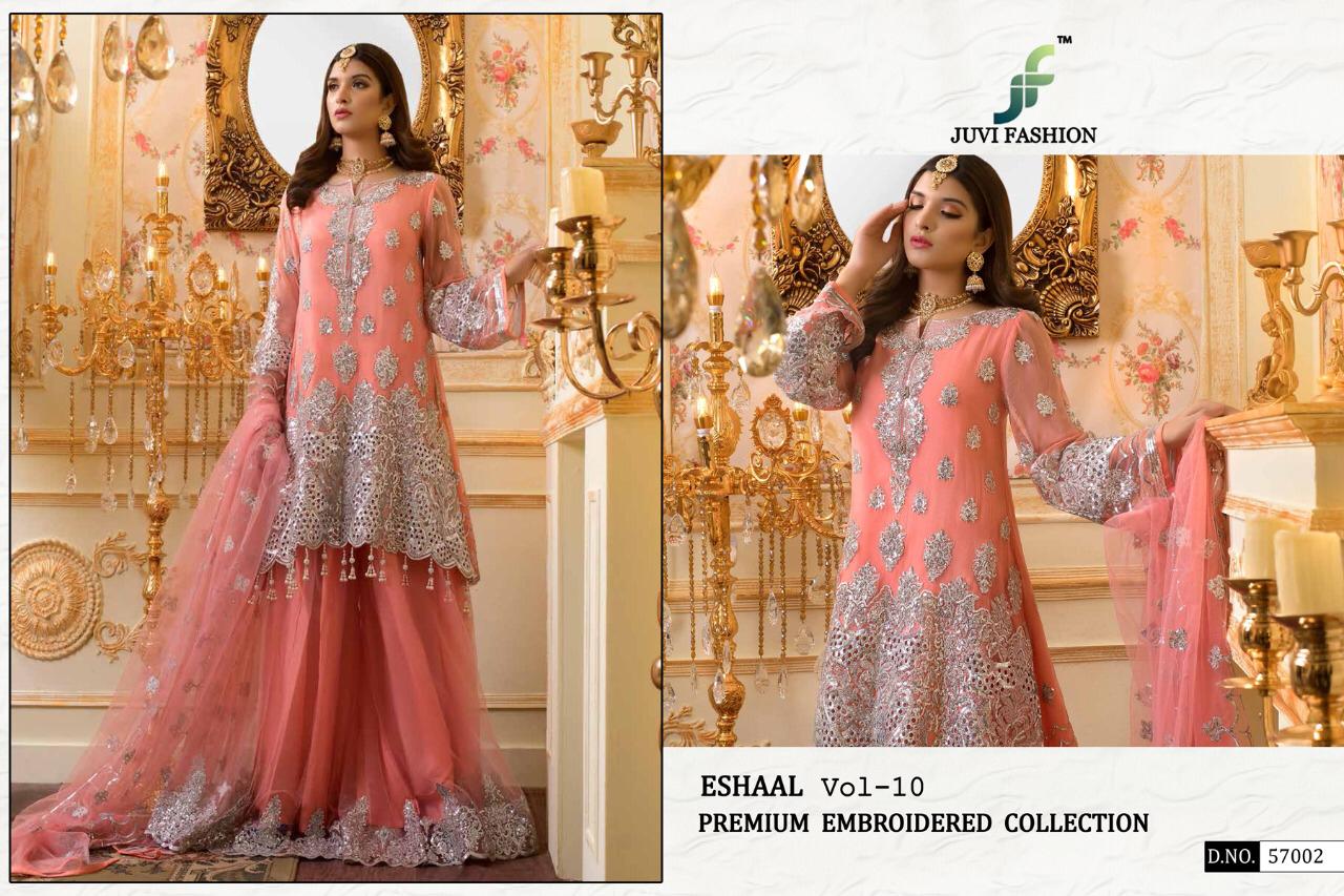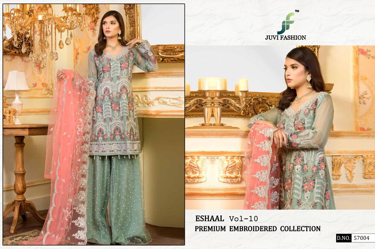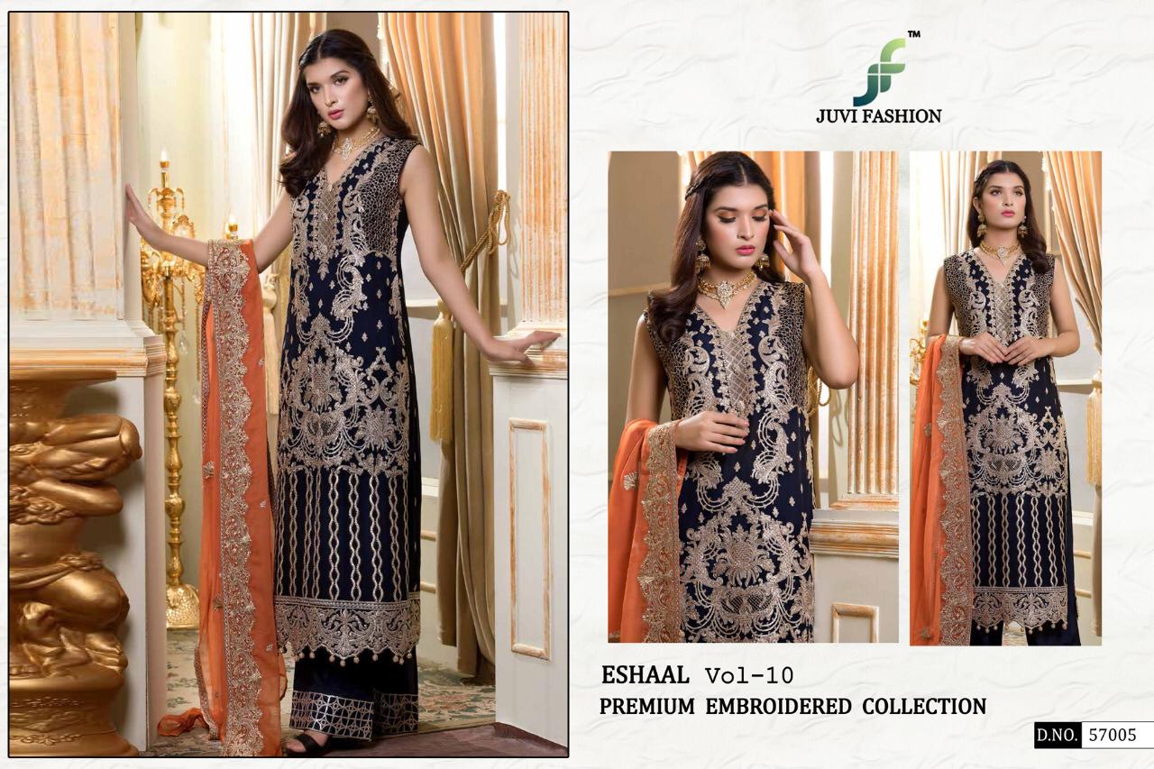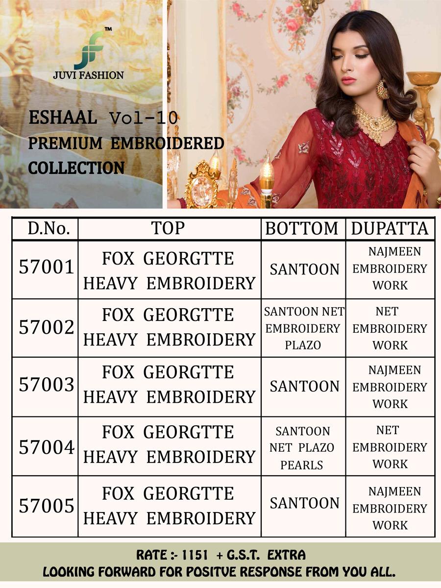 Buy Online Eshaal Vol 10 Premium Collection By Juvi Fashion Georgette Designer Pakistani Suits Wholesale Supplier Gujarat 5 Pcs of Full Catalogue at Wholesale Price. Looking for Eshaal Vol 10 Premium Collection By Juvi Fashion Georgette Designer Pakistani Suits Wholesale Supplier Gujarat Full Catalouge at Best Price? Buy Now Eshaal Vol 10 Premium Collection By Juvi Fashion Georgette Designer Pakistani Suits Wholesale Supplier Gujarat at Wholesale Rate of Rs 5755 with Total 5 Pcs from authroized dealer and supplier of Brand. Cost of Each piece is just only Rs 1151 which is very low and affordable price to resale the product in your retail store ,This is Surat based Wholesale Supplier & Dealer of Brand. Click on Brand name to Know more about Brand's products.Call or Whatsapp on 9898838984 for booking or enquiry