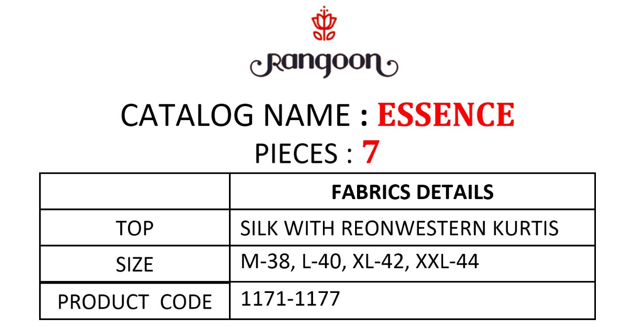 Buy Online Essence By Rangoon Series 1171 To 1177 Reyon Western Kurtis Catalog Wholesale Supplier And Dealer Nityanx Surat 7 Pcs of Full Catalogue at Wholesale Price. Looking for Essence By Rangoon Series 1171 To 1177 Reyon Western Kurtis Catalog Wholesale Supplier And Dealer Nityanx Surat Full Catalouge at Best Price? Buy Now Essence By Rangoon Series 1171 To 1177 Reyon Western Kurtis Catalog Wholesale Supplier And Dealer Nityanx Surat at Wholesale Rate of Rs 4375 with Total 7 Pcs from authroized dealer and supplier of RANGOON Brand. Cost of Each piece is just only Rs 625 which is very low and affordable price to resale the product in your retail store ,This is Surat based Wholesale Supplier & Dealer of RANGOON Brand. Click on Brand name to Know more about RANGOON Brand's products.Call or Whatsapp on 9898838984 for booking or enquiry
