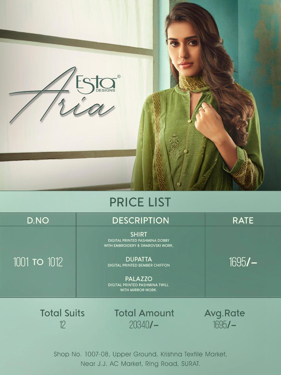 Buy Online Esta Aria Series 1001 To 1012 Pashmina Suit Wholesale Supplier Nd Dealer India 12 Pcs of Full Catalogue at Wholesale Price. Looking for Esta Aria Series 1001 To 1012 Pashmina Suit Wholesale Supplier Nd Dealer India Full Catalouge at Best Price? Buy Now Esta Aria Series 1001 To 1012 Pashmina Suit Wholesale Supplier Nd Dealer India at Wholesale Rate of Rs 20340 with Total 12 Pcs from authroized dealer and supplier of Brand. Cost of Each piece is just only Rs 1695 which is very low and affordable price to resale the product in your retail store ,This is Surat based Wholesale Supplier & Dealer of Brand. Click on Brand name to Know more about Brand's products.Call or Whatsapp on 9898838984 for booking or enquiry