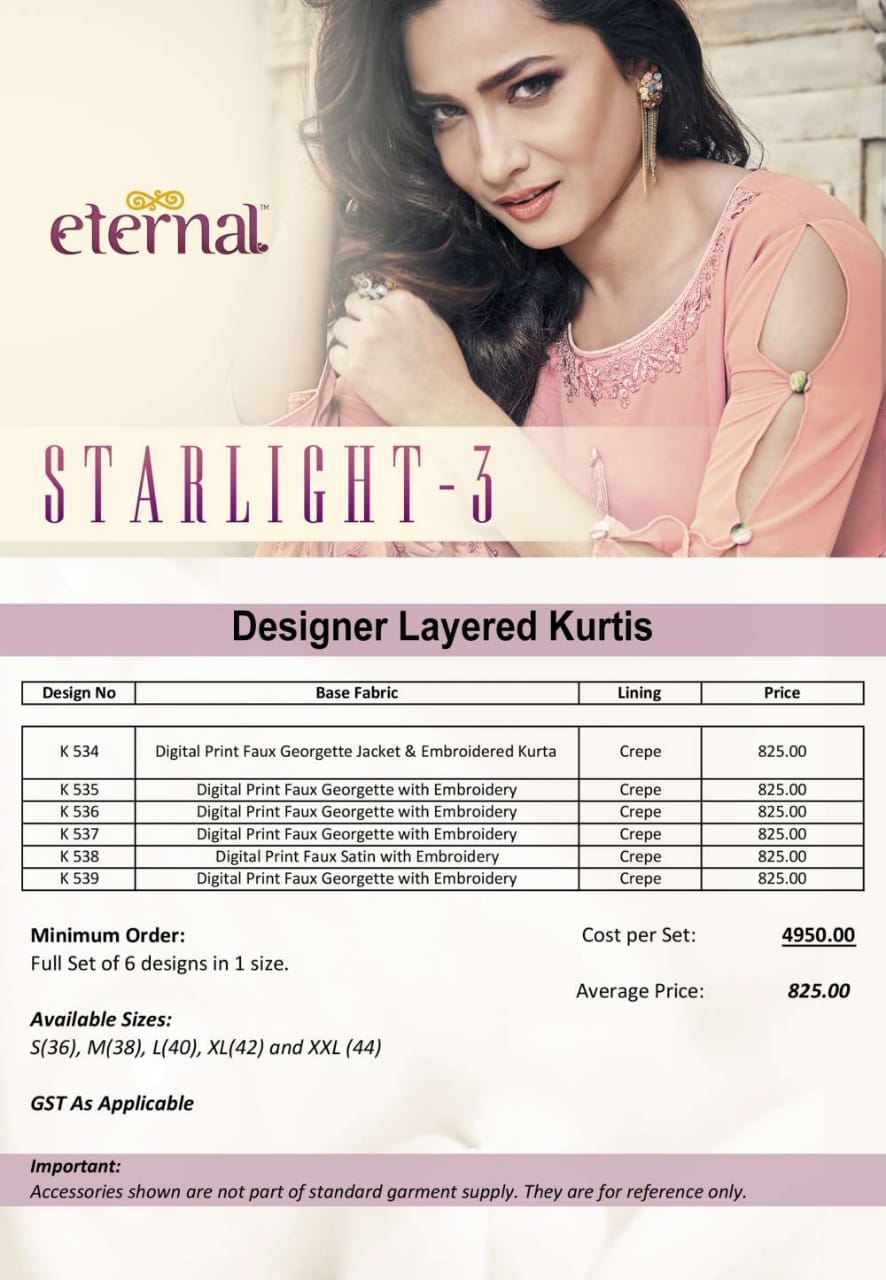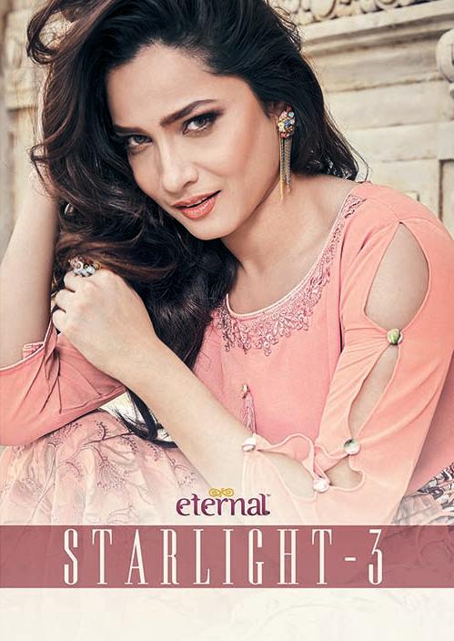 *Eternal* presents *StarLight 3* designer kurtis. Fabrics: Detail in Price List With Inner/Lining. Sizes: S, M, L, XL and XXL. Price: Rs.825 per piece Full Catalogue: Rs.4950 Total 6 design catalogue. Dispatching starts 27th August 2018. |