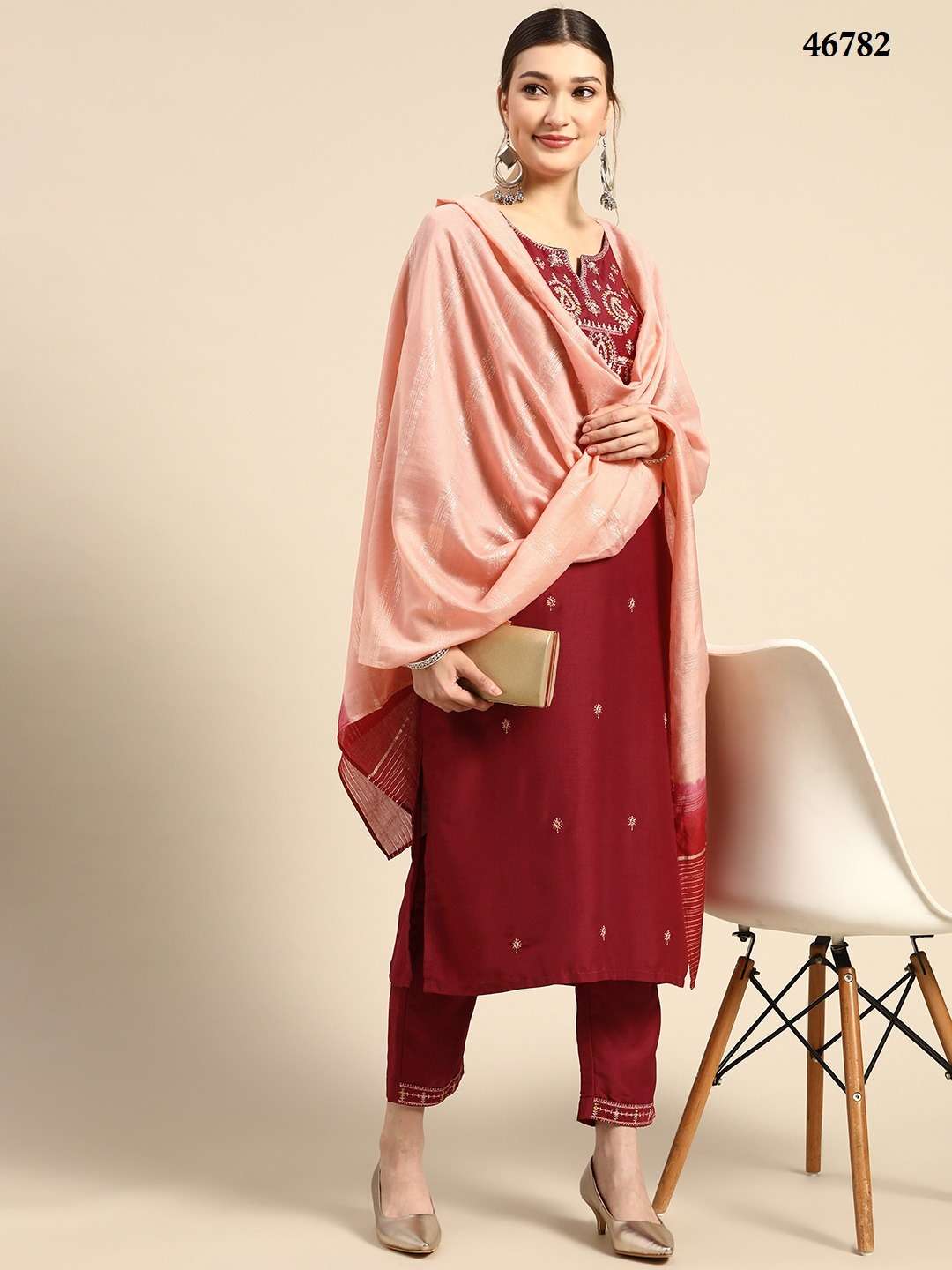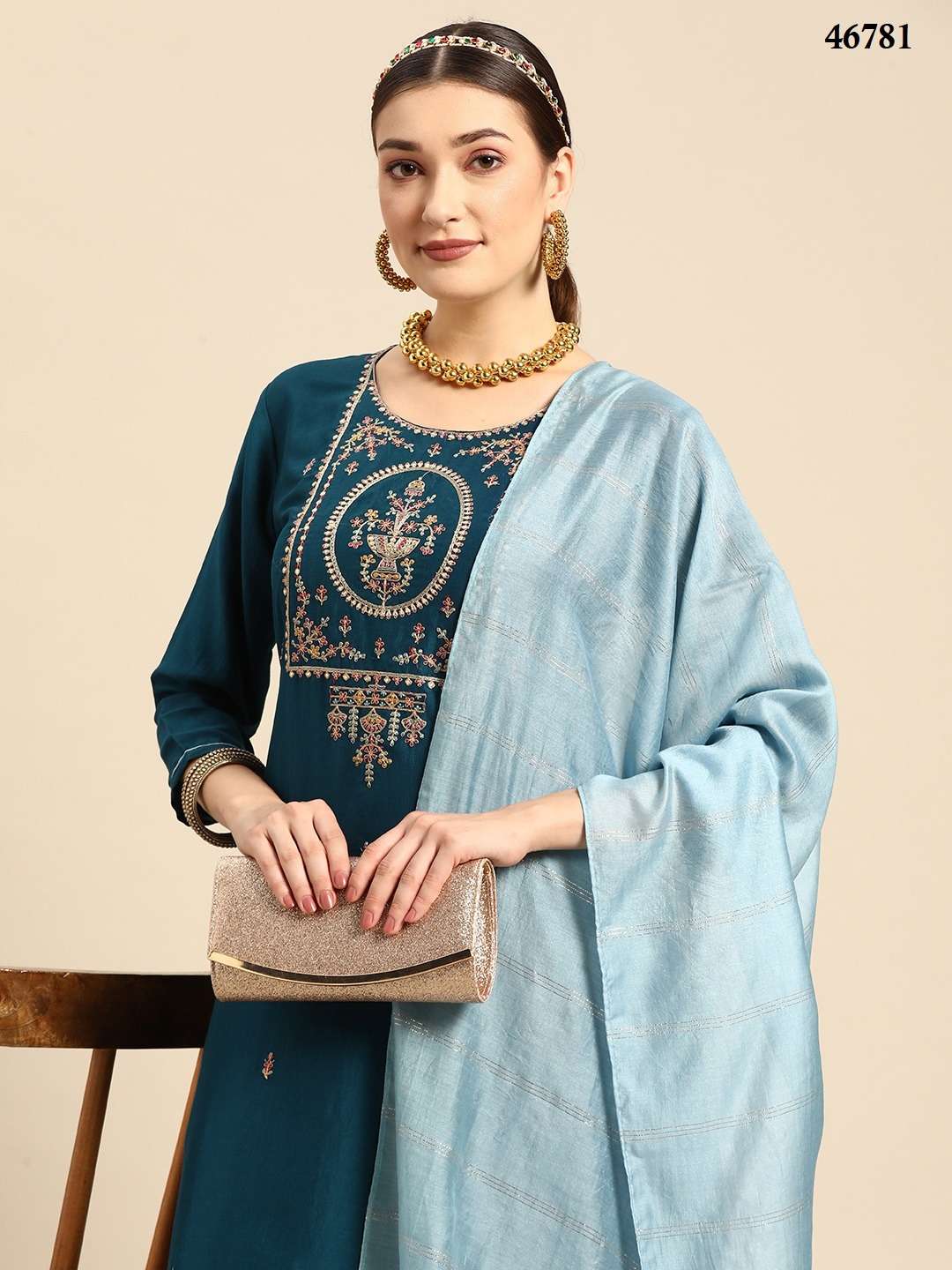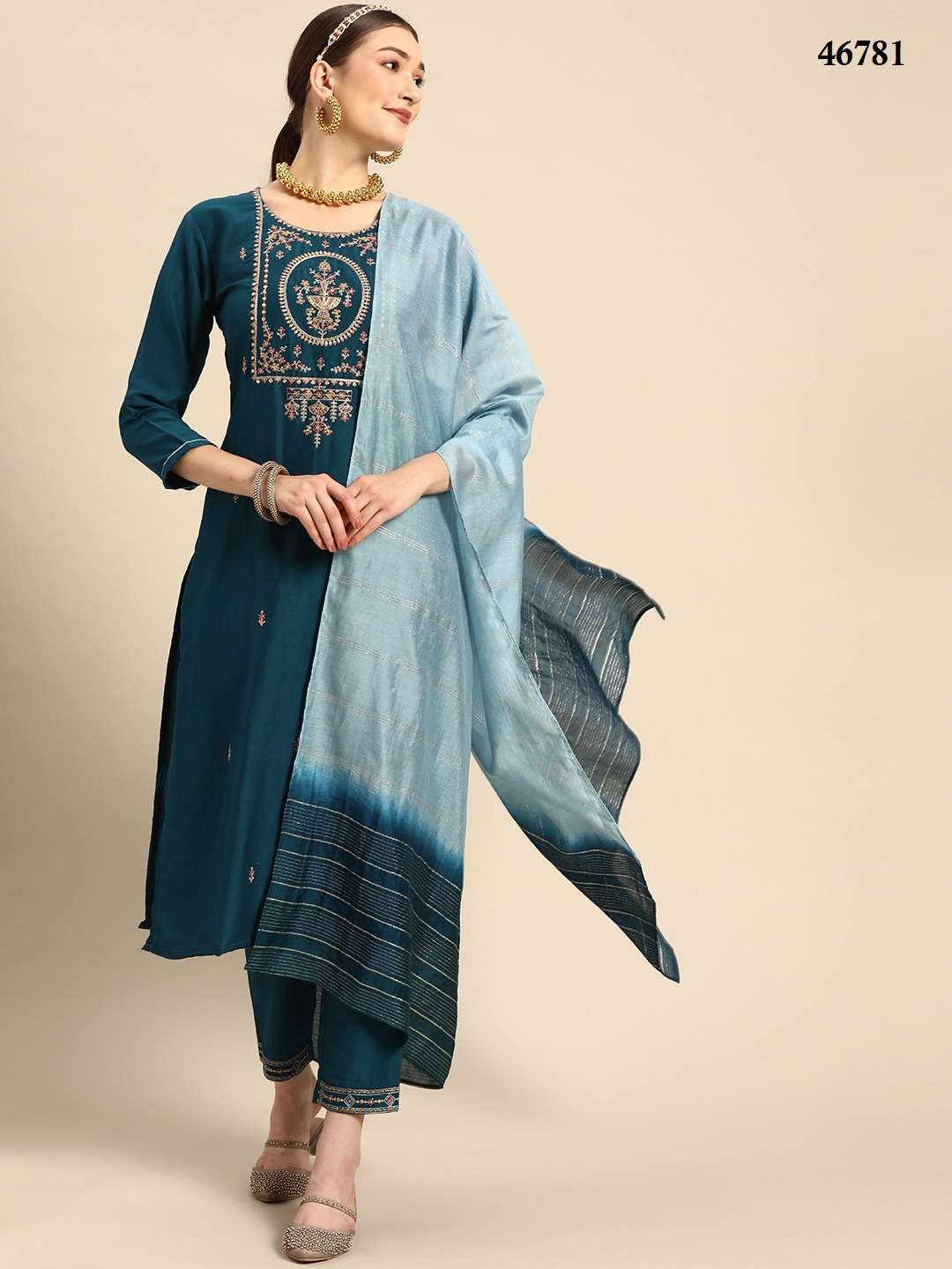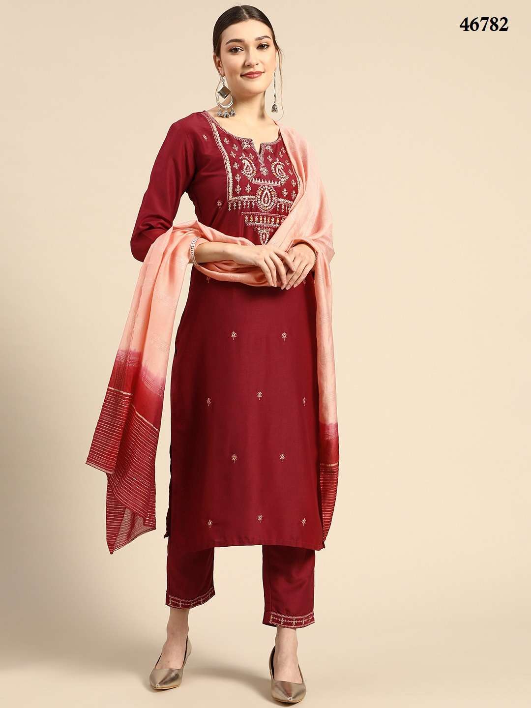 *Fabric Top :- Chinon Fabric With Floral Embroidery Work On Kurta Neck Line*