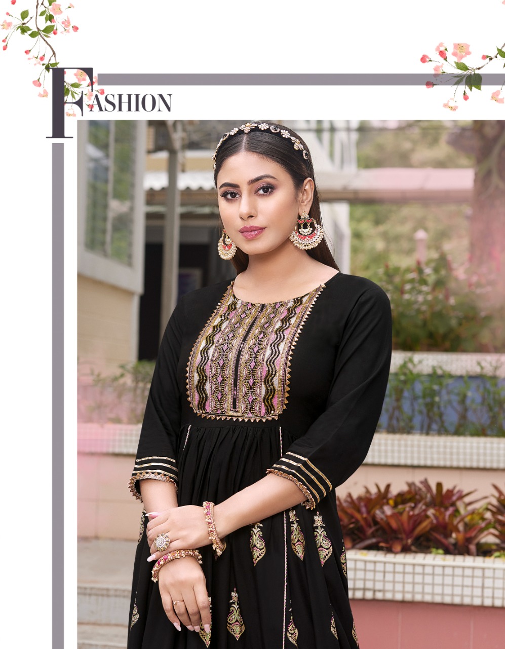 *?DIYA TRENDS?* (A Venture of KAJAL_ STYLE) Catalogue name: *ETHNICITY Vol.12* ?Details ?Pattern: *DESIGNER NYRA CUT KURTI GOWNS*(only top) ?Fabrics - *RAYON WITH SEQUENCE EMBROIDERY WORK & CLASSY GOLD PRINTS* ?Size - *S(18) M(19) L(20) XL(21) XXL(22) 3xl(23) 4XL(24) 5XL(25)* ? Length --> *46 to 48?* ?Designs- *1??0??Pcs* 490+5% gst Regards, VARNIRAJ TRENDS PVT LTD |