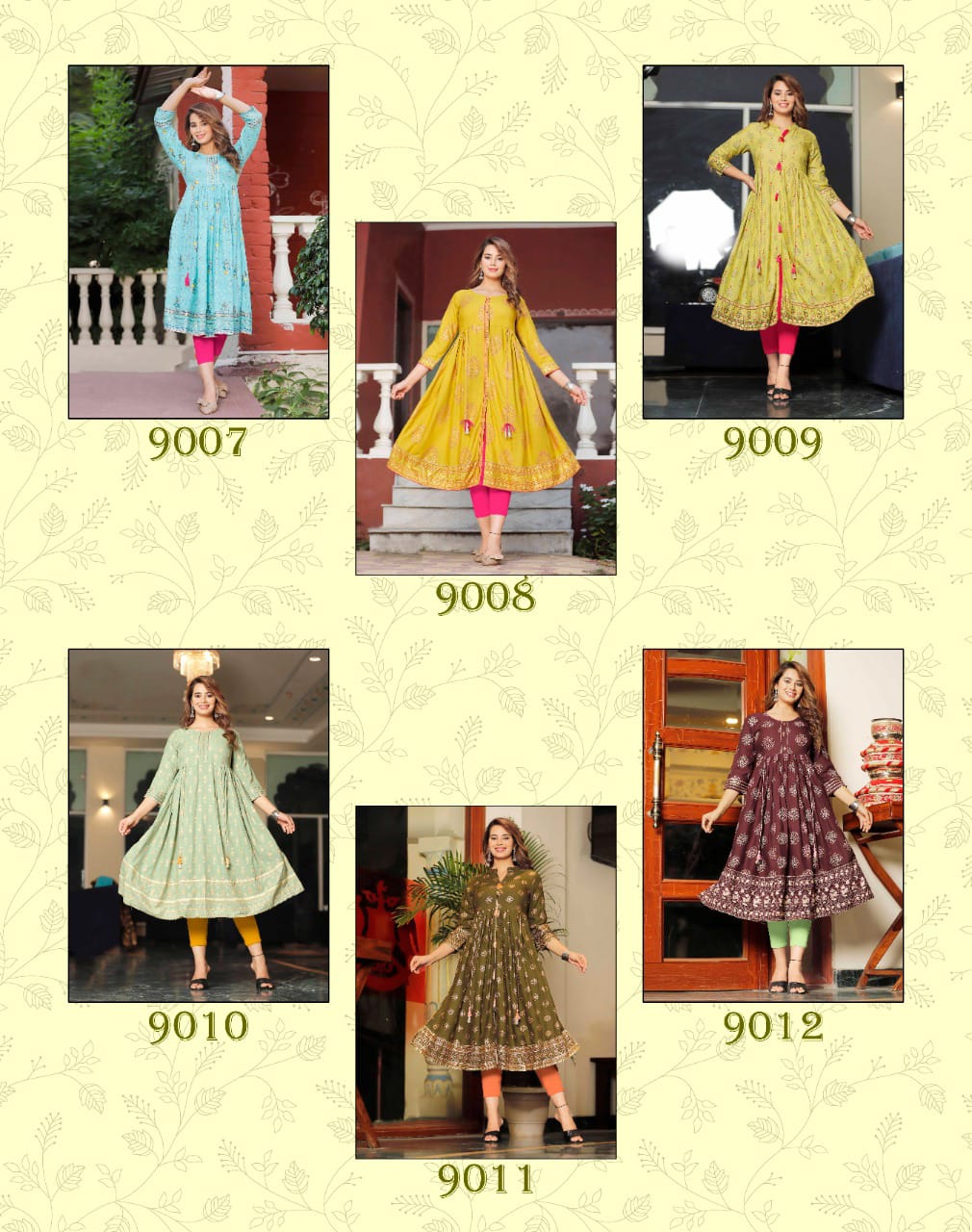 rate:- *4??4??5???GST* *?DIYA TRENDS?* (A Venture of KAJAL STYLE) Catalogue name: *ETHNICITY Vol.9* ?Details ?Pattern: *DESIGNERS KURTI GOWNS*(only kurti) ?Fabrics - *RAYON WITH FANCY EMBROIDERY WORK & CLASSY PRINTS* ?Size - *S(18) M(19) L(20) XL(21) XXL(22) 3xl(23) 4XL(24)* ? Length --> *46 to 48?* ?Designs- *12Pcs* ???????????????????????????????????? Regards, VARNIRAJ TRENDS PVT LTD |