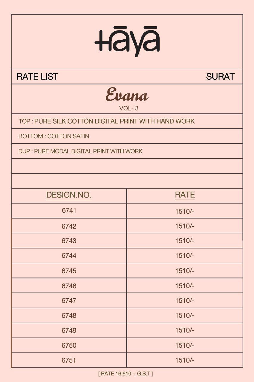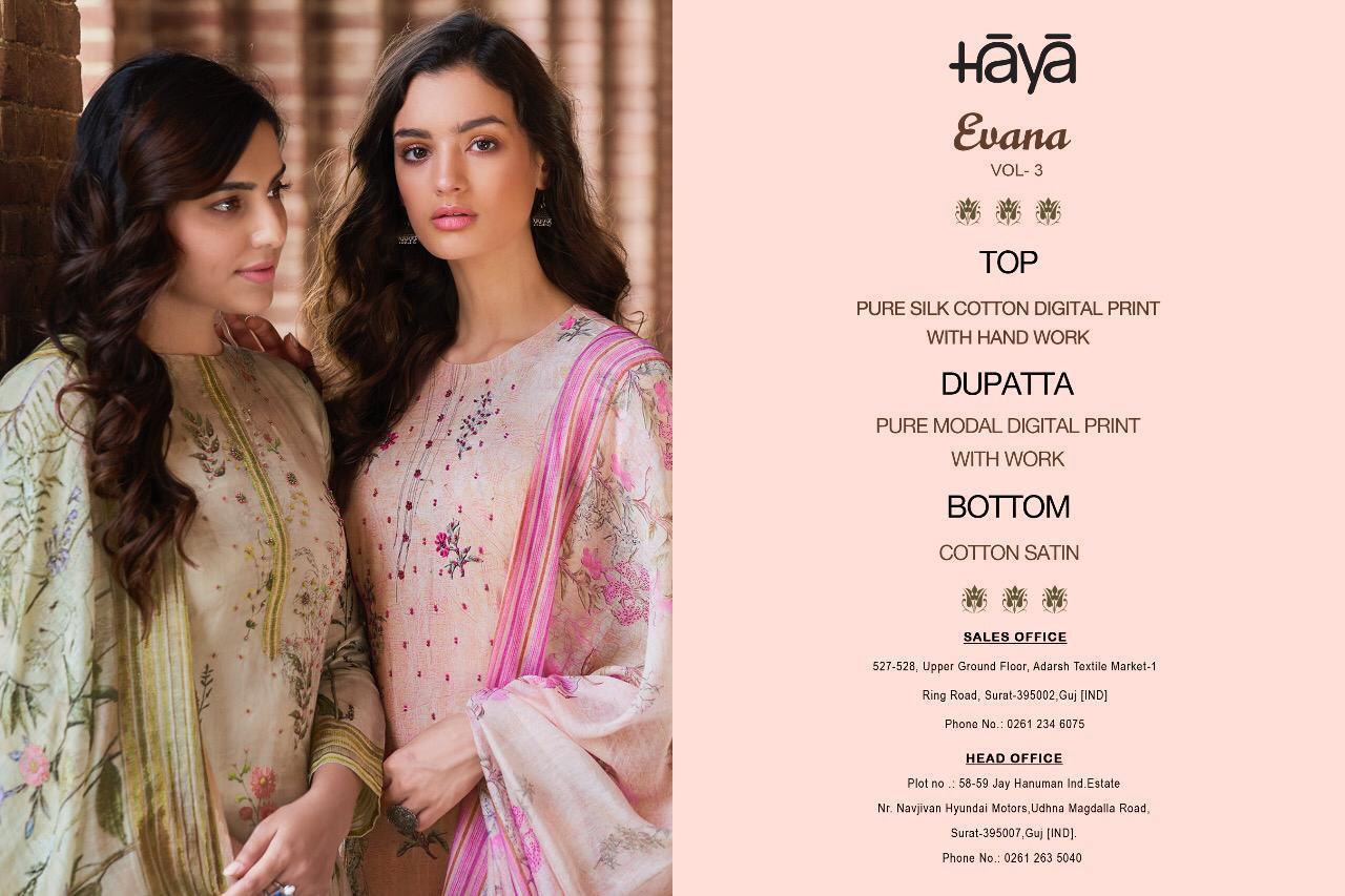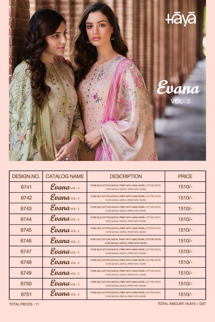 Brand- Haya . Catlog name Â? EVANA VOL -3. Set To Set. 11 Design Singal Colour Fabric Details Top = Pure Cotton Silk Digital Print With Hand Work Bottom = Cotton Satin Dupatta = Pure Modal Digital Print With Work Total pieces = 11 Rate = 1510/- Set to set. GST 5 Percent Extra Delivery 5-6 days . |