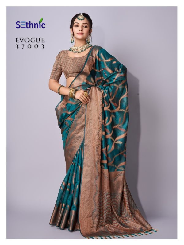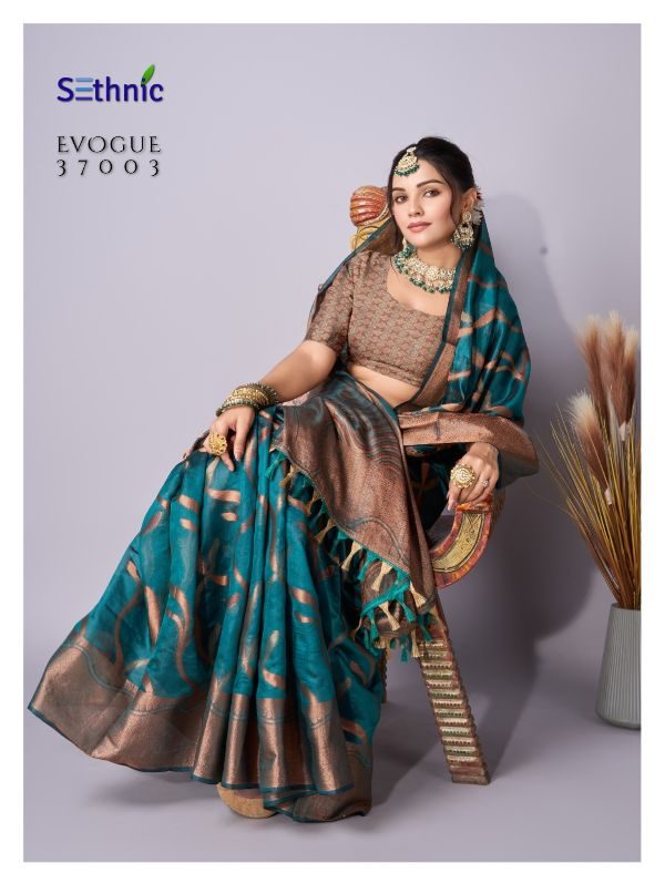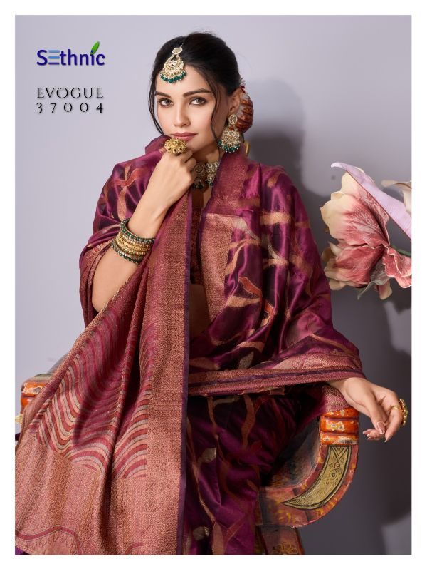 Brand - Sethnic Lifestyle Catalog: Evogue Vol 1 (37001 to 37005) Saree Fabric Detail : Organza With All Over Abstract Pattern Zari Weaving Broad Patta, Rich Pallu Embellish Attractive Designer Fumka Latkan Set on Pallu Blouse : Designer Brocade Rate : 699+5 %Gst Style : Party Wear, Festival Wear 100+ SINGLE |