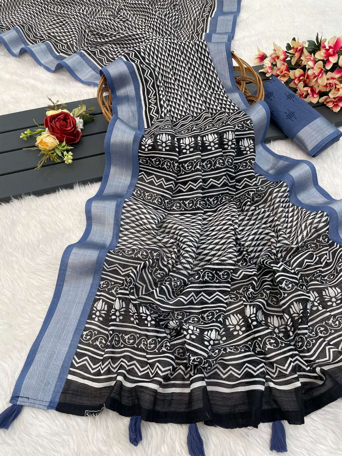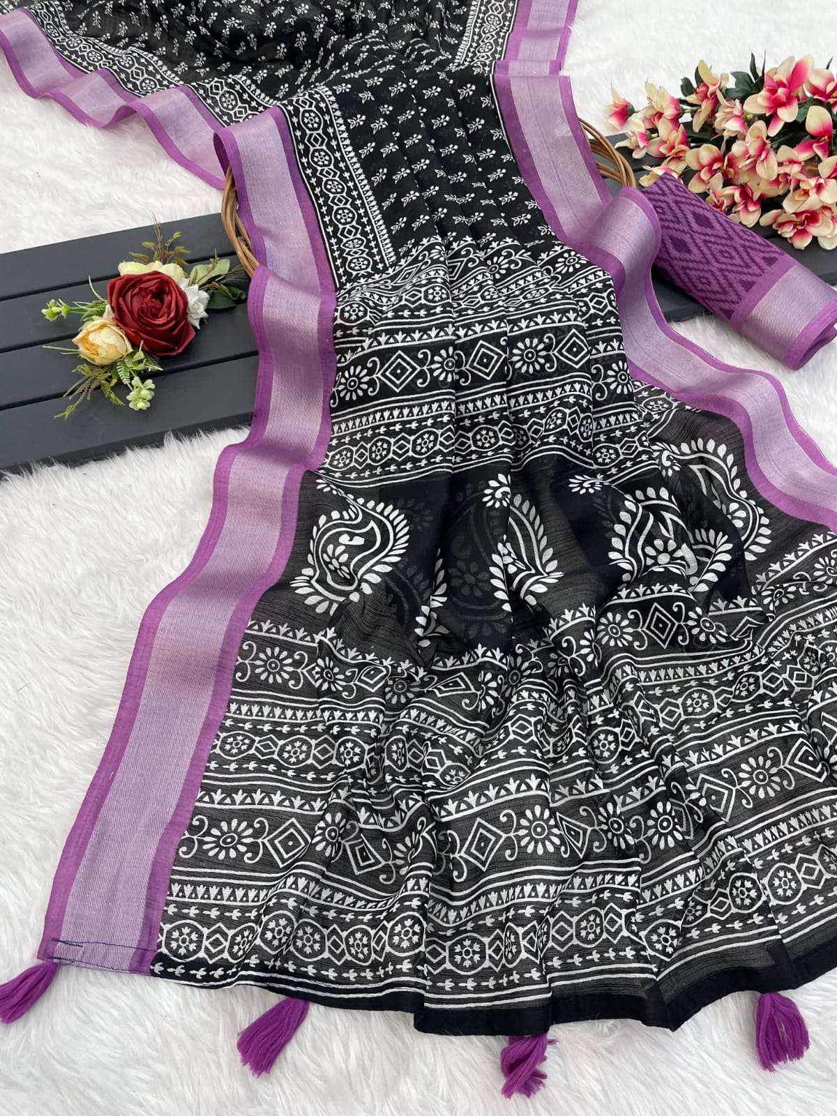 Introducing our exclusive soft Cotton Linen saree, designed to give you a perfect blend of comfort and contemporary elegance. The saree features all-over premium digital prints, beautifully highlighted with a rich copper zari border. The stylish printed pallu adds charm, while the matching blouse comes with attached tassels for a trendy finish. A perfect choice for daily elegance, office wear, and festive gatherings. 👌 Best quality assured |