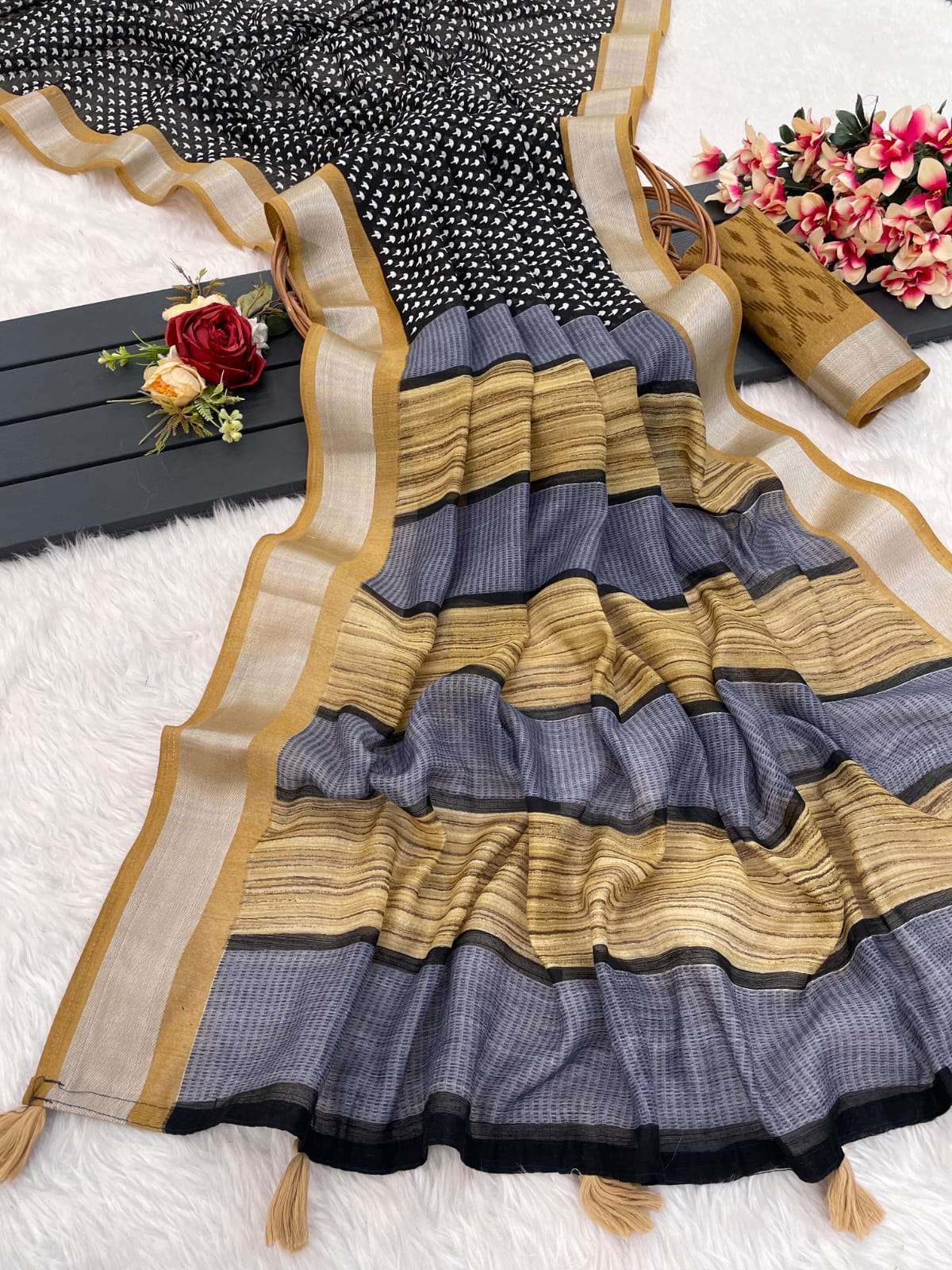 Exclusive Soft Cotton Linen Saree with Digital Print & Copper Zari Border
