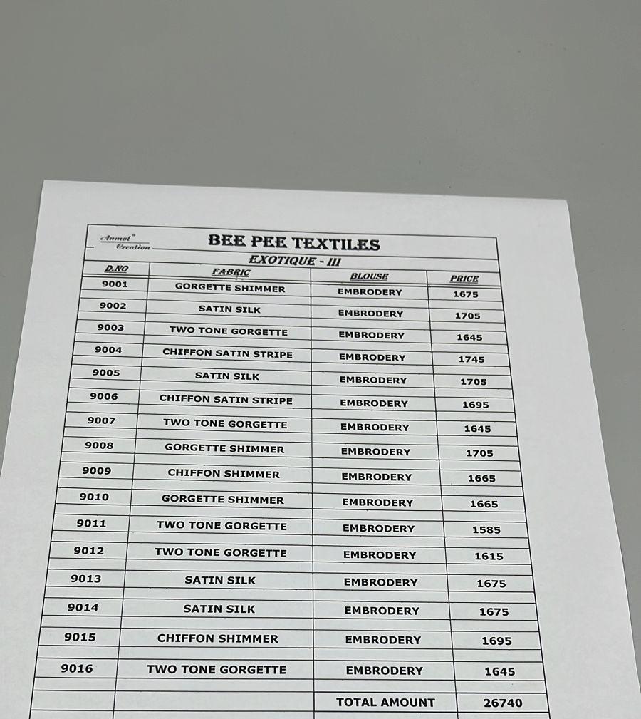 Buy Online Exotique Vol 3 Series 9001 To 9016 By Anmol Creation Fancy Saree Collection Manufacturer Surat 16 Pcs of Full Catalogue at Wholesale Price. Looking for Exotique Vol 3 Series 9001 To 9016 By Anmol Creation Fancy Saree Collection Manufacturer Surat Full Catalouge at Best Price? Buy Now Exotique Vol 3 Series 9001 To 9016 By Anmol Creation Fancy Saree Collection Manufacturer Surat at Wholesale Rate of Rs 0 with Total 16 Pcs from authroized dealer and supplier of ANMOL SAREE Brand. Cost of Each piece is just only Rs 0 which is very low and affordable price to resale the product in your retail store ,This is Surat based Wholesale Supplier & Dealer of ANMOL SAREE Brand. Click on Brand name to Know more about ANMOL SAREE Brand's products.Call or Whatsapp on 9898838984 for booking or enquiry