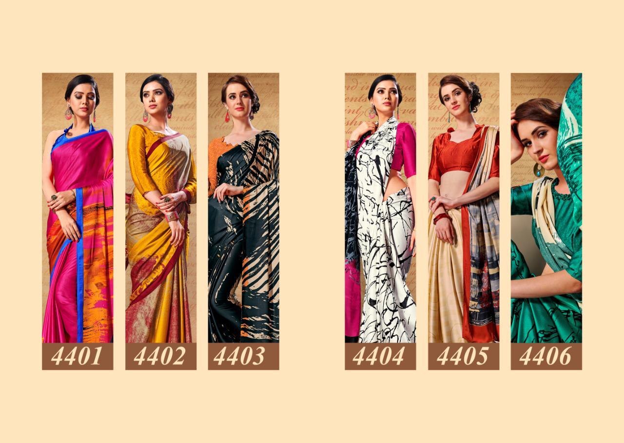 Buy Online Extraordinarie By Sushma 4401 Series Fancy Satin Printed Saree Catlog Wholesale Dealer Surat 6 Pcs of Full Catalogue at Wholesale Price. Looking for Extraordinarie By Sushma 4401 Series Fancy Satin Printed Saree Catlog Wholesale Dealer Surat Full Catalouge at Best Price? Buy Now Extraordinarie By Sushma 4401 Series Fancy Satin Printed Saree Catlog Wholesale Dealer Surat at Wholesale Rate of Rs 4140 with Total 6 Pcs from authroized dealer and supplier of SUSHMA Brand. Cost of Each piece is just only Rs 690 which is very low and affordable price to resale the product in your retail store ,This is Surat based Wholesale Supplier & Dealer of SUSHMA Brand. Click on Brand name to Know more about SUSHMA Brand's products.Call or Whatsapp on 9898838984 for booking or enquiry