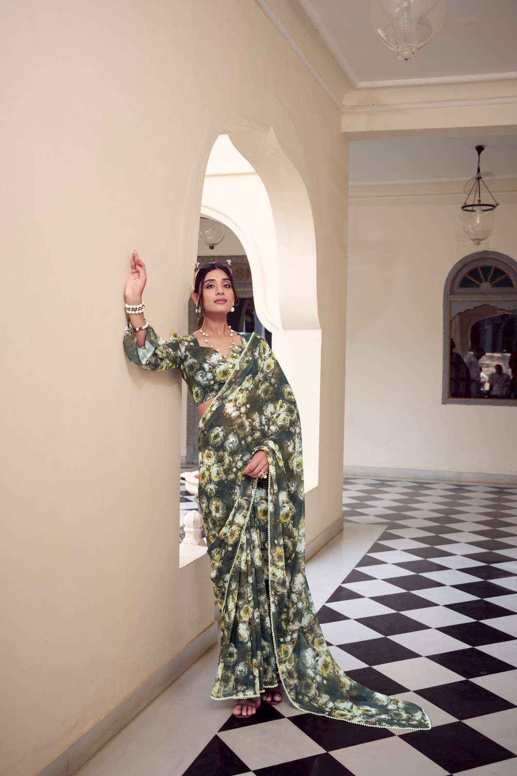 *Saree* Saree Fabric : Weightless Marbal Saree work : Floral Printed With Pearl Lace Border Saree length : 5.5 meter