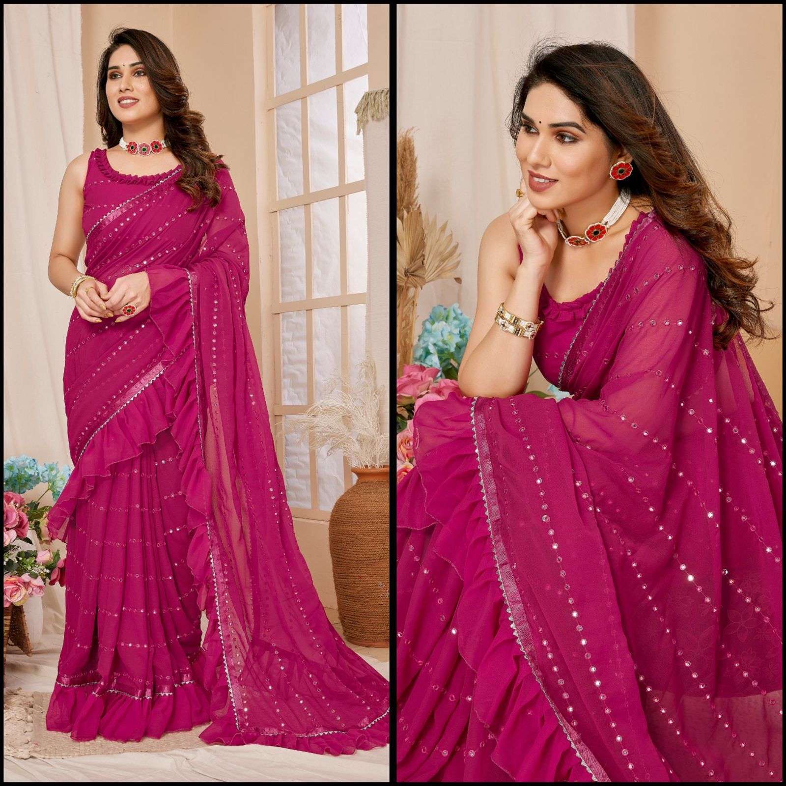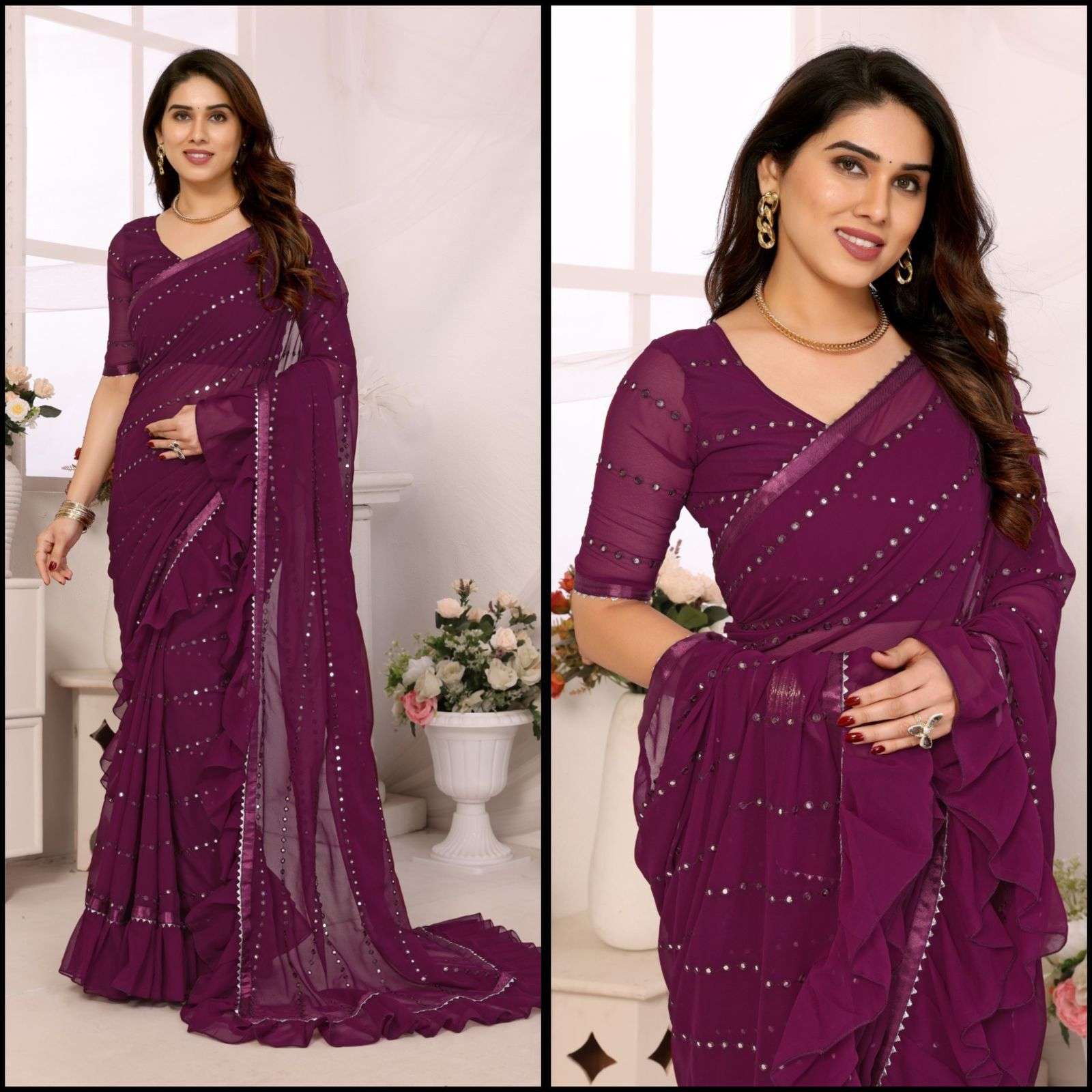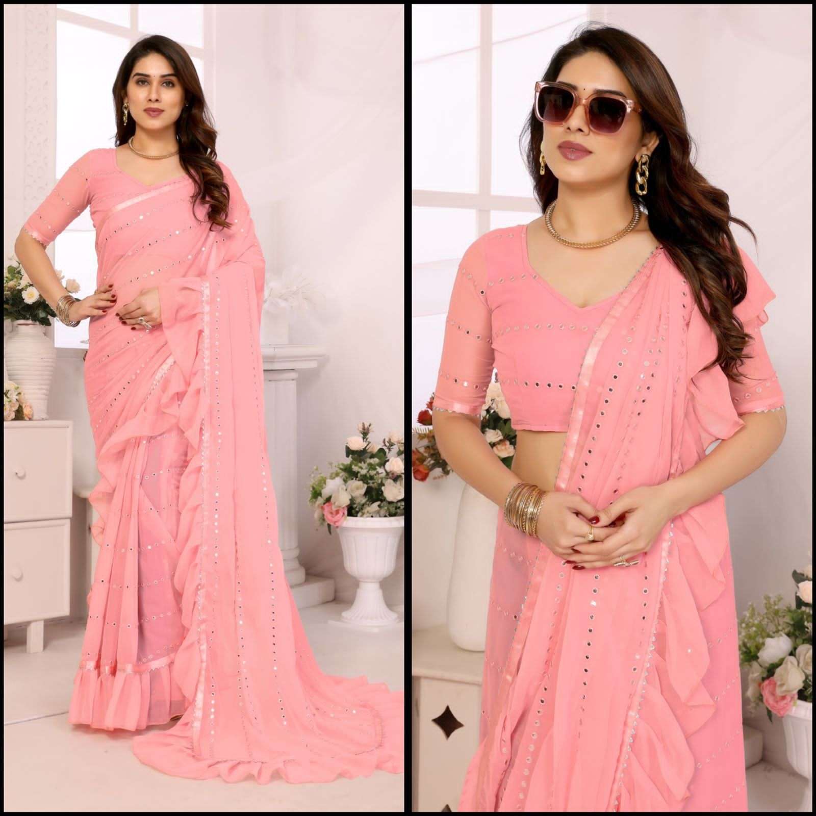 *PATTERN-RUFFAL SAREE WITH MIRROR WORK*