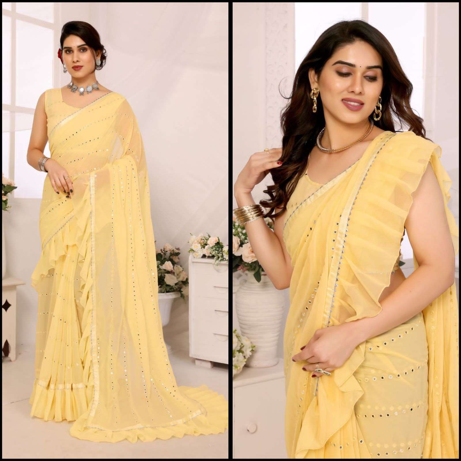 *😍Saree look rich georgette silk ruffal saree oWith Beautiful Tone colour Mirror Work saree😍*
