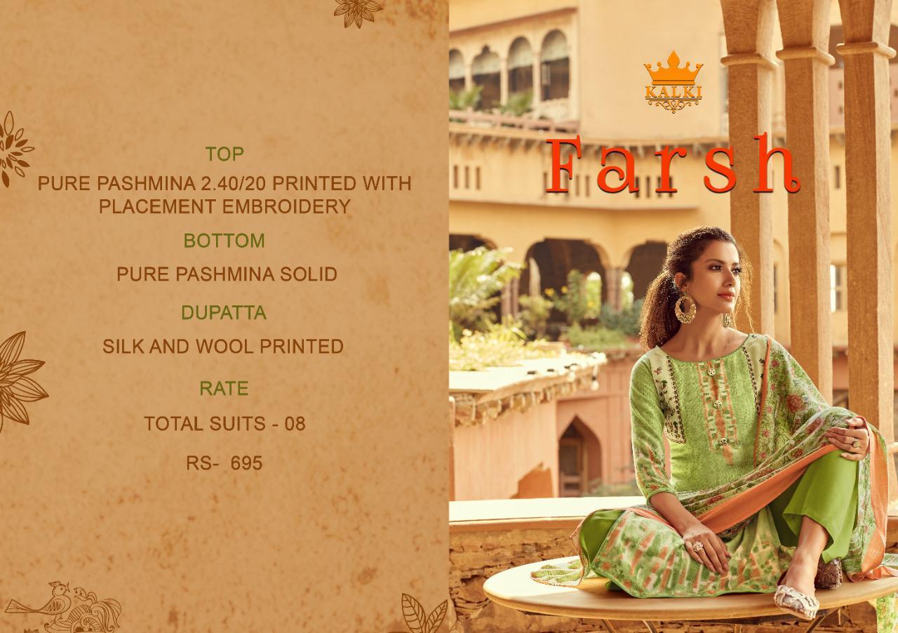 Buy Online Farsh By Kalki Pashmina Dress Materials Wholesale Supplier Gujarat 8 Pcs of Full Catalogue at Wholesale Price. Looking for Farsh By Kalki Pashmina Dress Materials Wholesale Supplier Gujarat Full Catalouge at Best Price? Buy Now Farsh By Kalki Pashmina Dress Materials Wholesale Supplier Gujarat at Wholesale Rate of Rs 5560 with Total 8 Pcs from authroized dealer and supplier of Brand. Cost of Each piece is just only Rs 695 which is very low and affordable price to resale the product in your retail store ,This is Surat based Wholesale Supplier & Dealer of Brand. Click on Brand name to Know more about Brand's products.Call or Whatsapp on 9898838984 for booking or enquiry