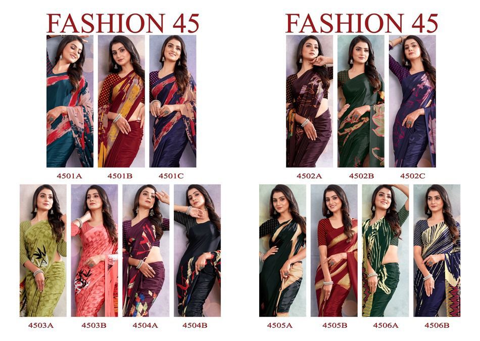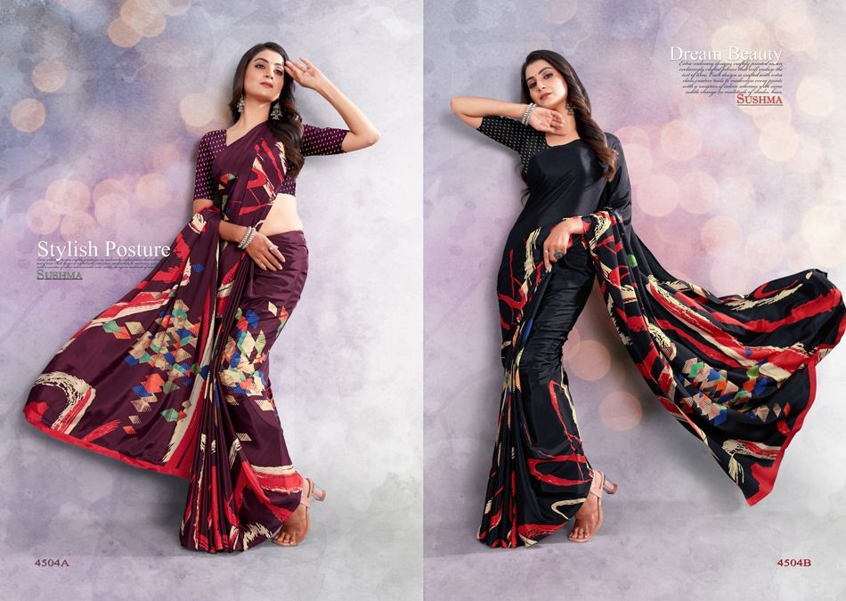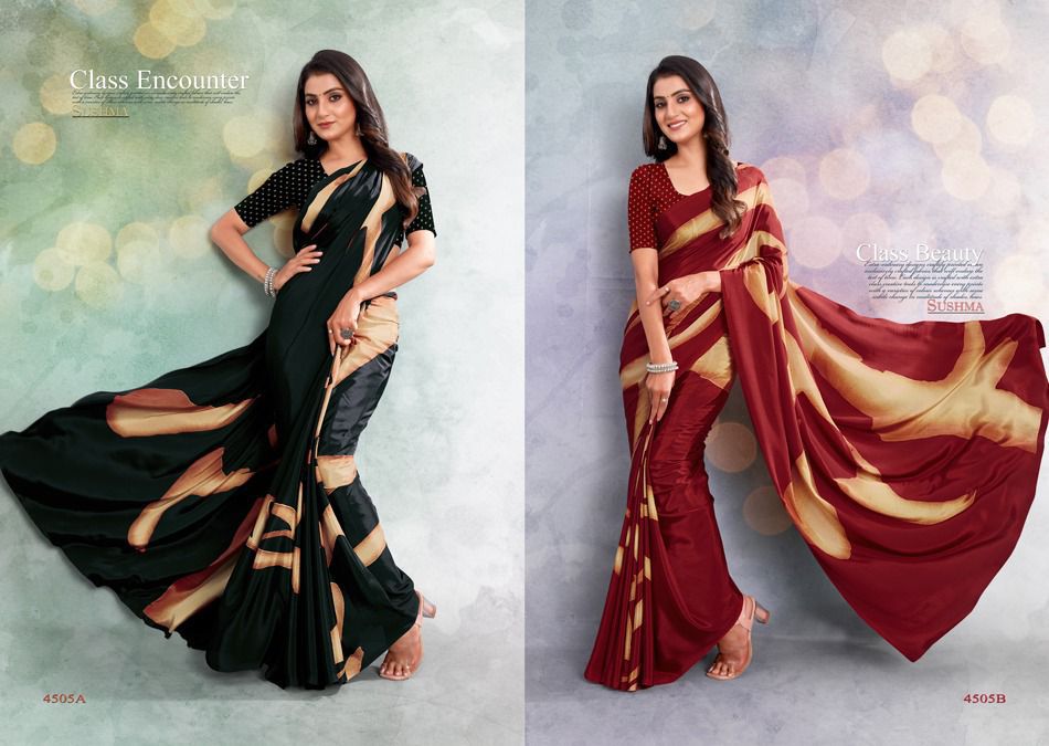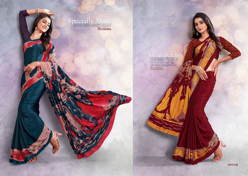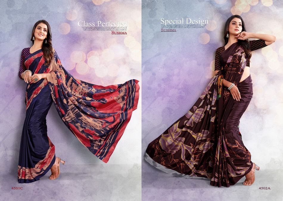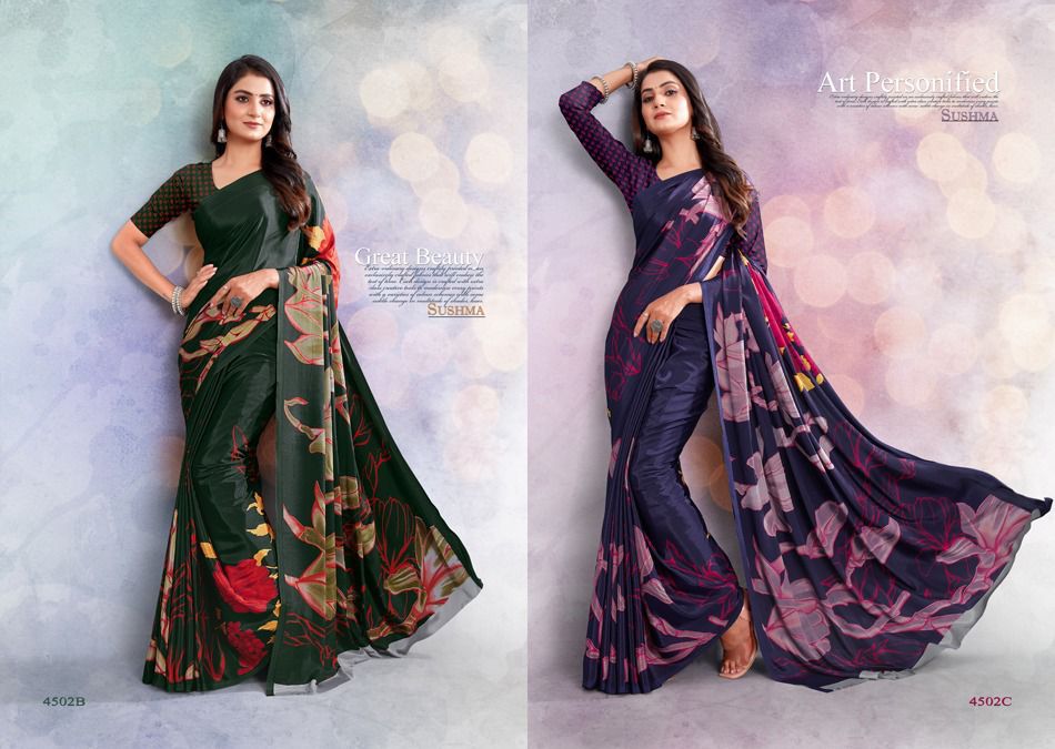 Buy Online Fashion 45 Sushma Crape Sarees 14 Pcs of Full Catalogue at Wholesale Price. Looking for Fashion 45 Sushma Crape Sarees Full Catalouge at Best Price? Buy Now Fashion 45 Sushma Crape Sarees at Wholesale Rate of Rs 8610 with Total 14 Pcs from authroized dealer and supplier of Sushma Saree Brand. Cost of Each piece is just only Rs 615 which is very low and affordable price to resale the product in your retail store ,This is Surat based Wholesale Supplier & Dealer of Sushma Saree Brand. Click on Brand name to Know more about Sushma Saree Brand's products.Call or Whatsapp on 9898838984 for booking or enquiry