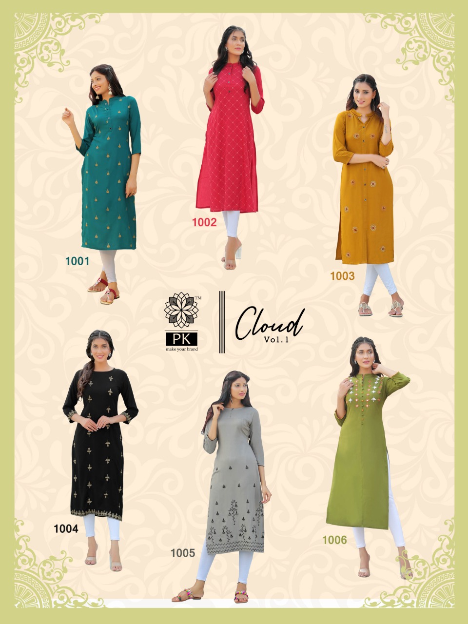 Brand - PK Catalog - FASHION CLOUD VOL 1 Fabric - Rayon Fancy Work With Liva Tag Size - S(36), M(38), L(40), XL(42), XXL(44), 3XL(46), 4XL(48) Designs - 6 Rate - 440 Rs + 5% GST Thanks *ARADHNA* |