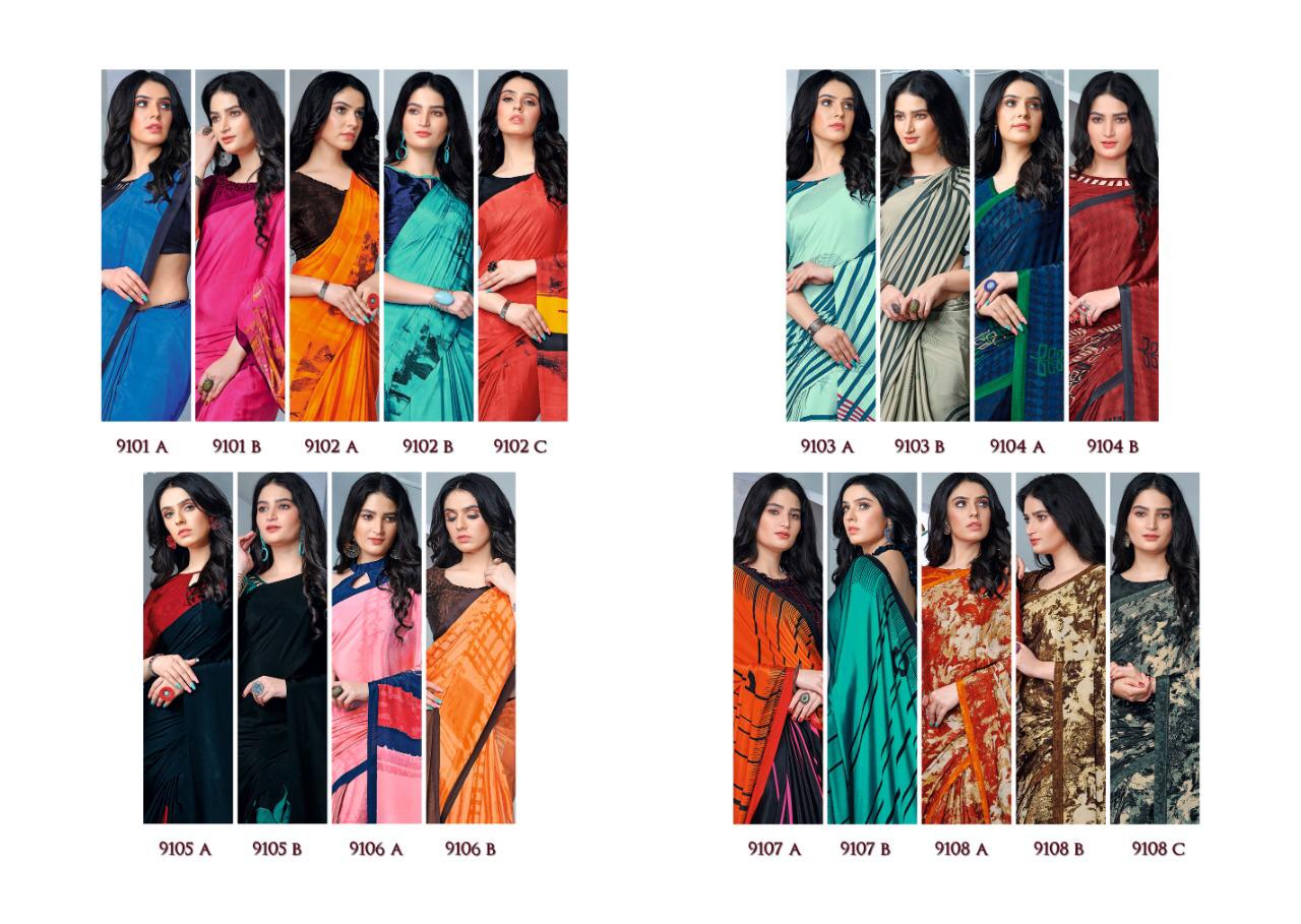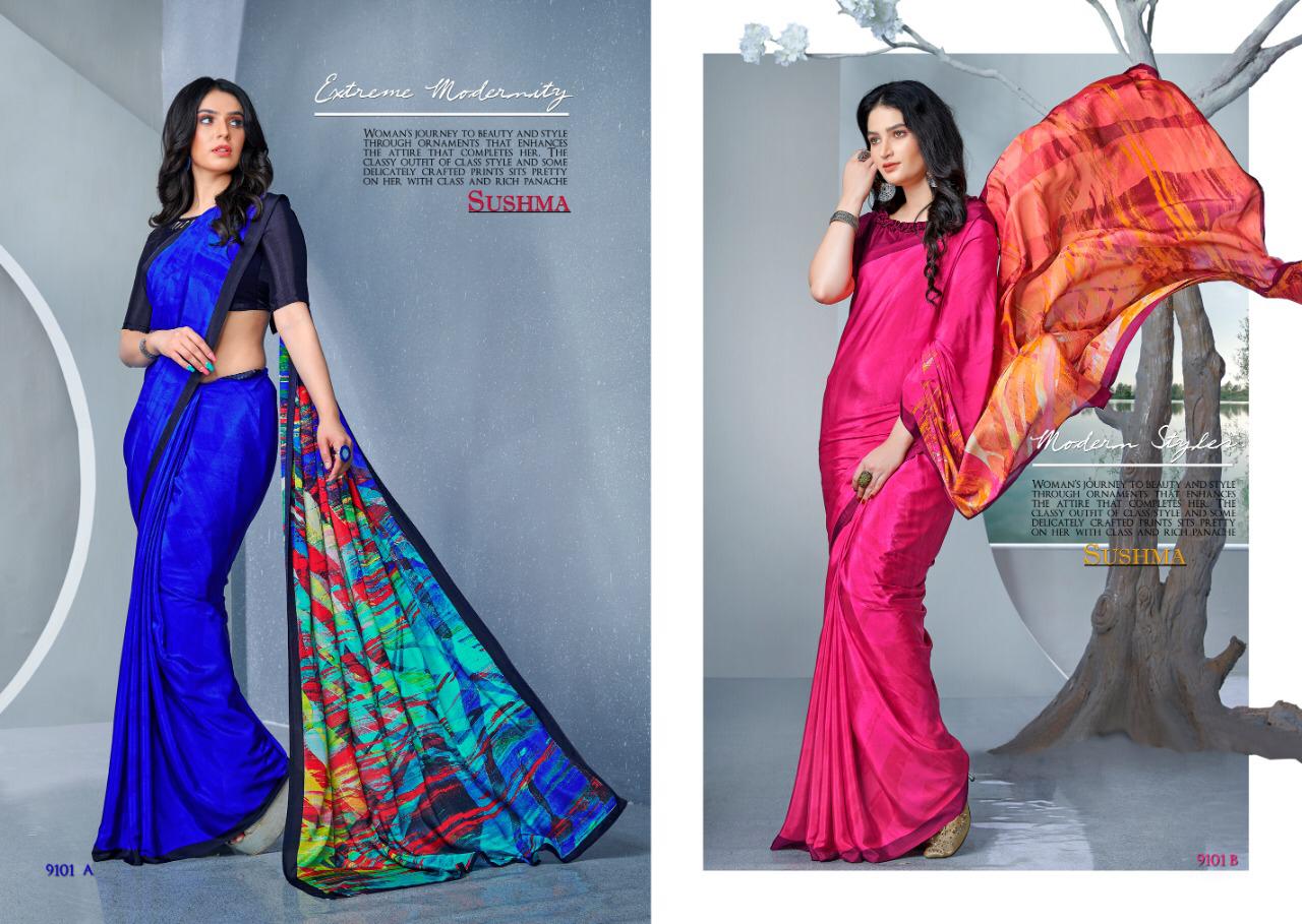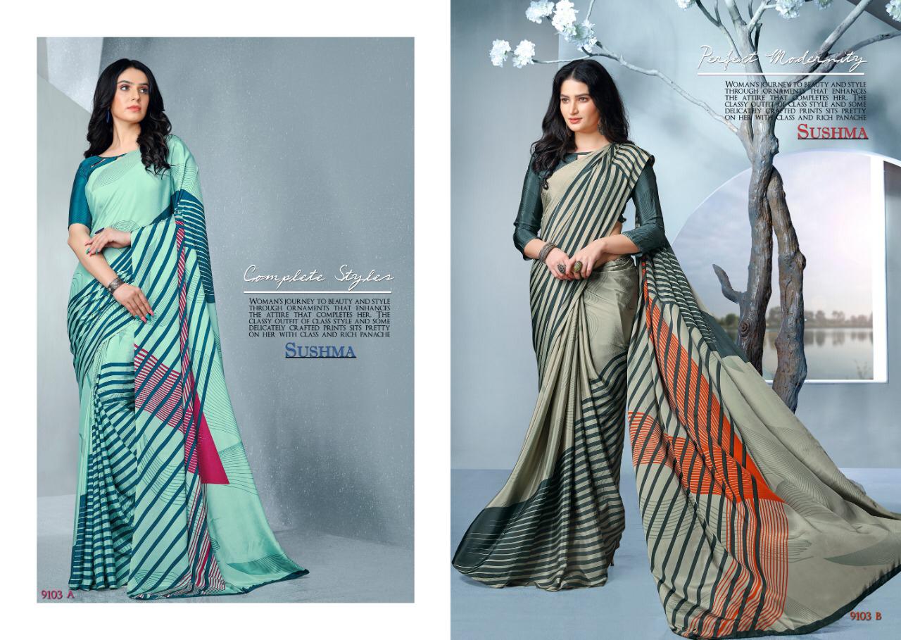 FASHION FAB CATALOG (9101 SERIES) by Susham STYLE CRAPE 590/- 18 SAREES Set to set . GSt 5 Percent Extra. Delivery from today |