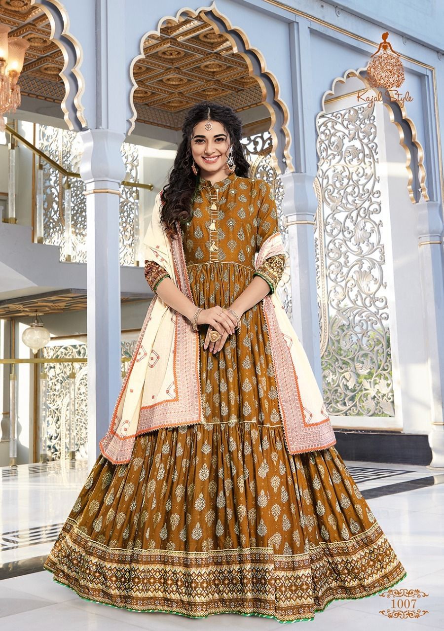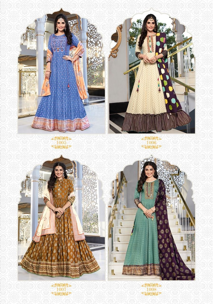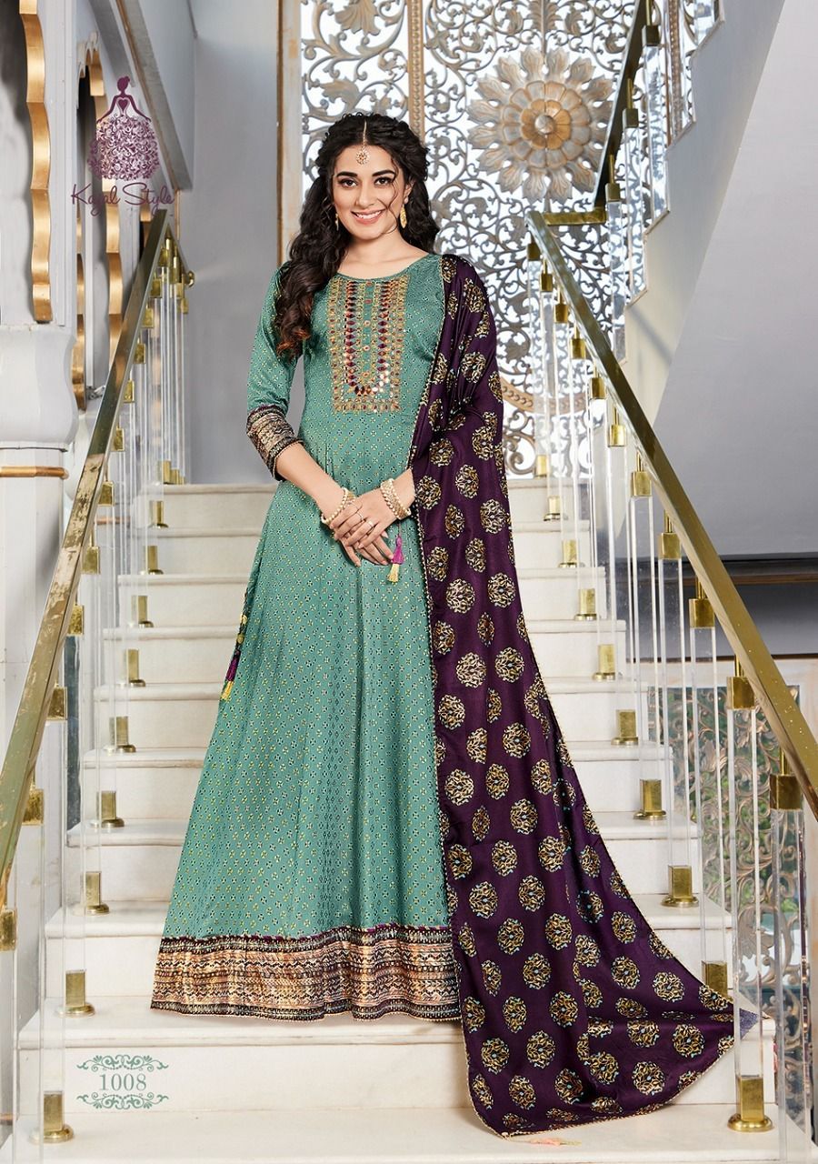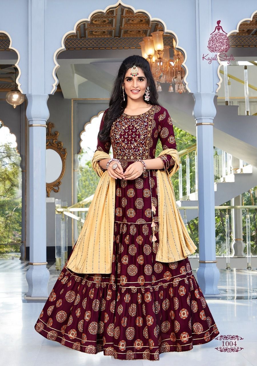 *_Designer dupatta collection with Gown kurti ._* ? ? ? *KAJAL STYLE* Catalogue name: ? *_Fashion Hirva Vol.1_*? ?Details: ?Pattern :- *Designer Gown Style With Dupatta*? *?Fabrics* *?? Heavy Reyon* *?? Fancy Embroidery work* *?? Foil Prints* ?Size - *S M L XL 2XL 3XL 4XL* ? Length Â?> *52+* ?Designs - *8?? Pcs* ??????hurryyy uppp....Book your order now...????????? Regards, *Varniraj Industries Pvt Ltd* Rate -899/- plus gst |