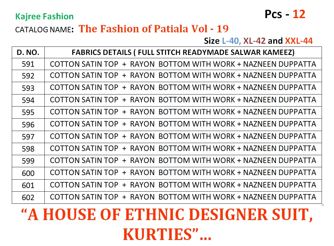 ??Kajree fashion has launch new catalog " Fashion of Patiala Vol - 19"?? ?Details :- ?Catalog Name :- Fashion of Patiala Vol - 19 ?Designs :- 1?2? pcs ??Fabric :- ?? ?Top :- COTTON SATIN ?Bottom :- RAYON WITH WORK ? Duppatta :- NAZNEEN ?Size :- L - 40, XL - 42, XXL - 44? RATE - 1049/- ?Dispatching 4 to 5 Days Later? ?Hurry up..Hurry up...please place your order soon...? ?Booking started from now..+919898938984.??????????? ?Book your order soon.. |