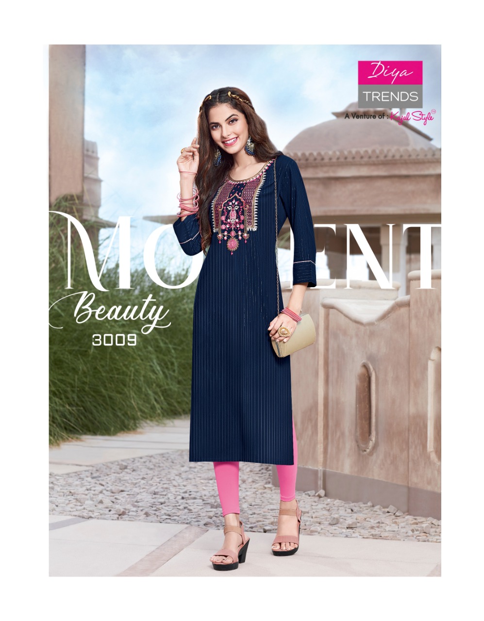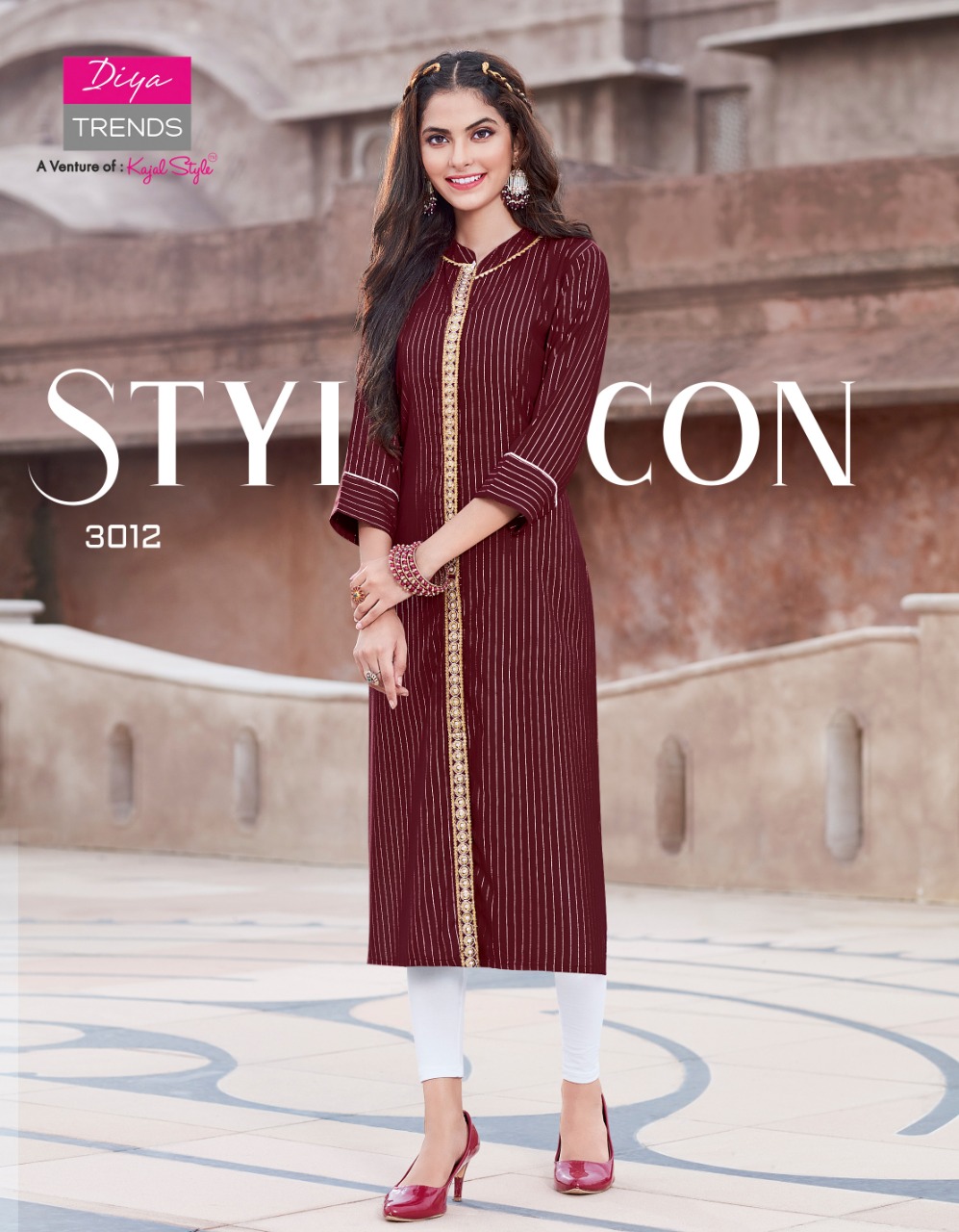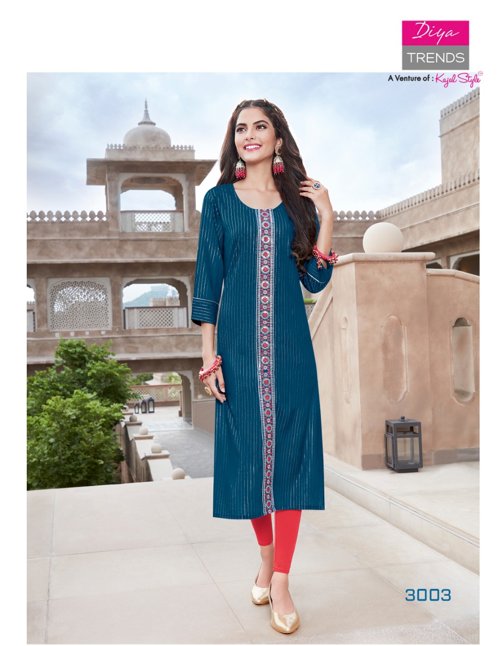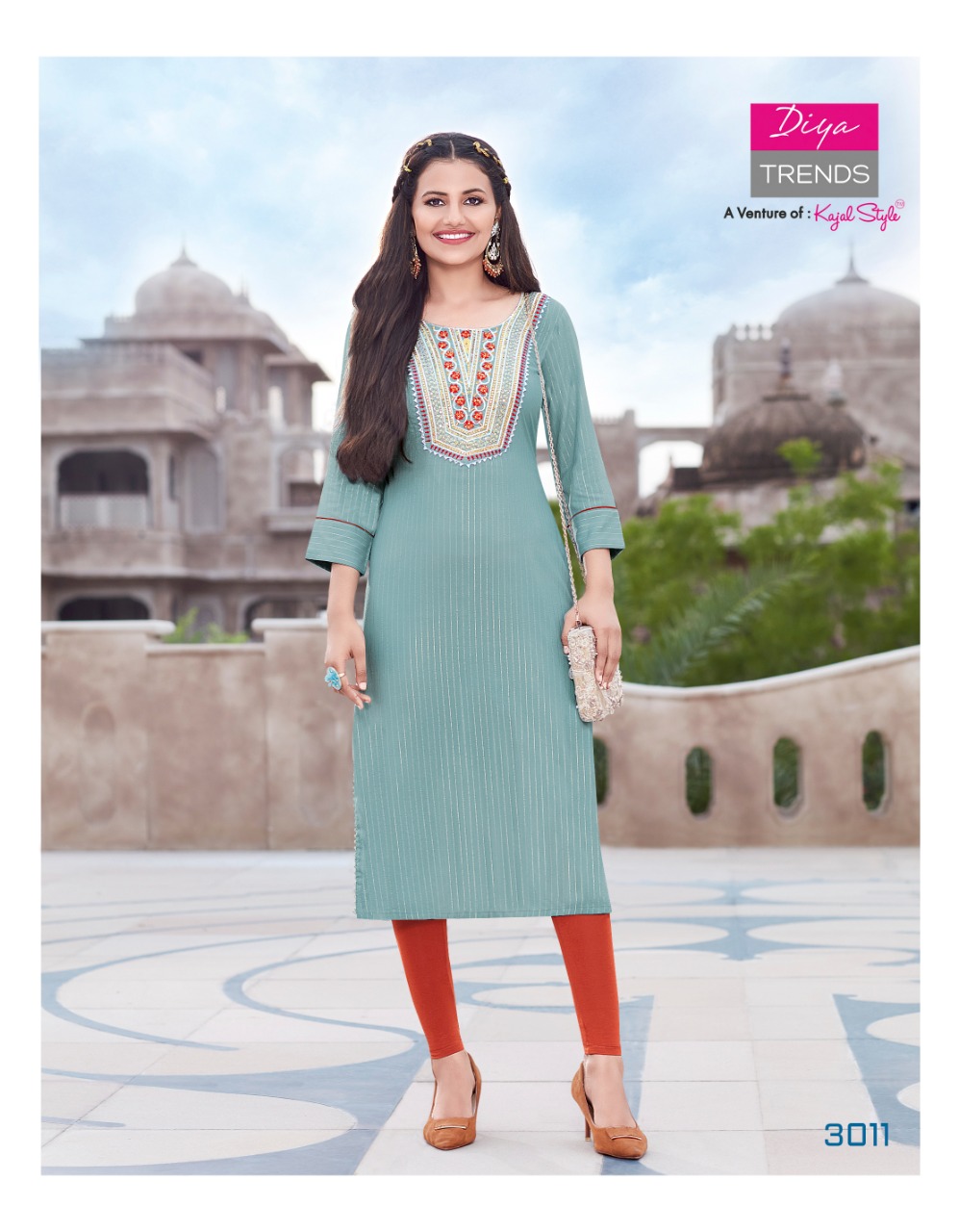 *?DIYA TRENDS?* (A Venture of KAJAL STYLE) Catalogue name: *FASHION STORY VOL 3* *(Only Kurti)* ?Details ?Fabrics - *FANCY REYON (14 KG)* ?Pattern: *STRAIGHT KURTI WITH SEQUENCE EMBROIDERY WORK* ?Size - *S(18) M(19) L(20) XL(21) XXL(22) 3xl(23) 4xl(24) 5xl(25)* ? Length --> *46?* ?Designs- *12 pcs* |