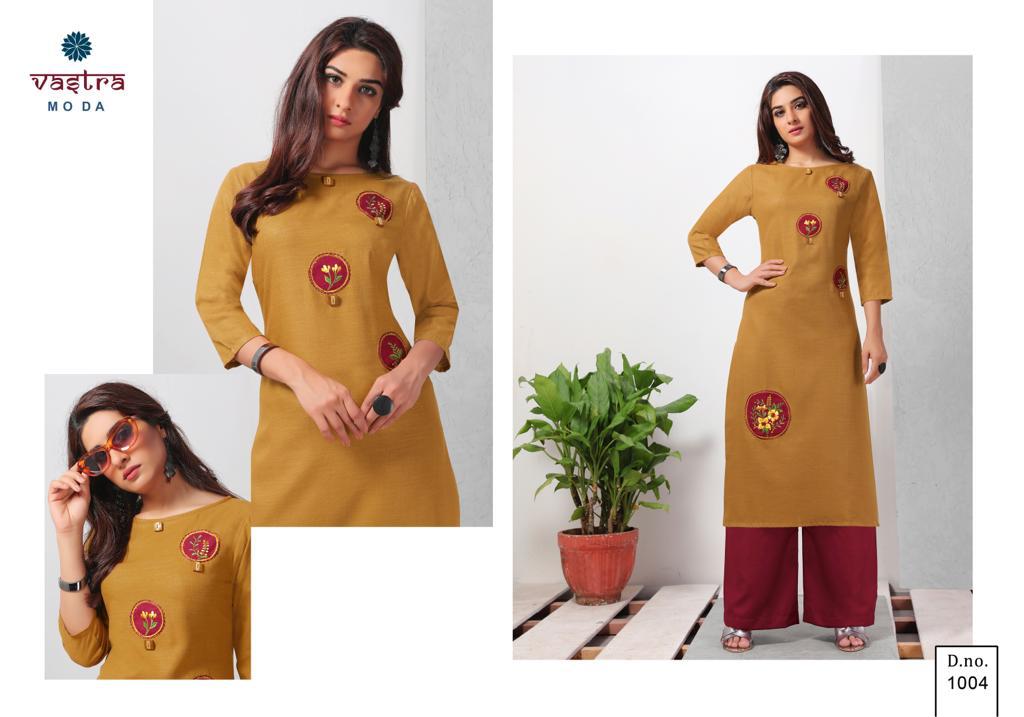 Buy Online Fashion Vol 1 By Vastra Moda Cotton Kurtis With Plazzo Wholesale Supplier Surat 8 Pcs of Full Catalogue at Wholesale Price. Looking for Fashion Vol 1 By Vastra Moda Cotton Kurtis With Plazzo Wholesale Supplier Surat Full Catalouge at Best Price? Buy Now Fashion Vol 1 By Vastra Moda Cotton Kurtis With Plazzo Wholesale Supplier Surat at Wholesale Rate of Rs 4400 with Total 8 Pcs from authroized dealer and supplier of Brand. Cost of Each piece is just only Rs 550 which is very low and affordable price to resale the product in your retail store ,This is Surat based Wholesale Supplier & Dealer of Brand. Click on Brand name to Know more about Brand's products.Call or Whatsapp on 9898838984 for booking or enquiry