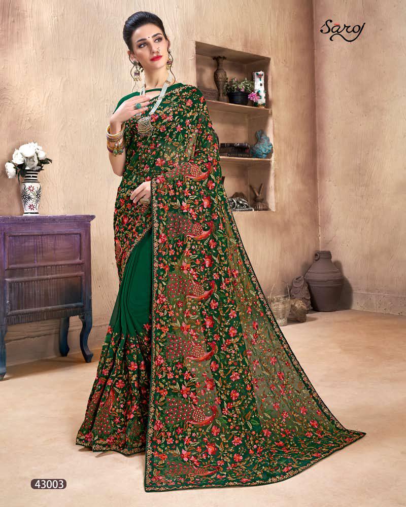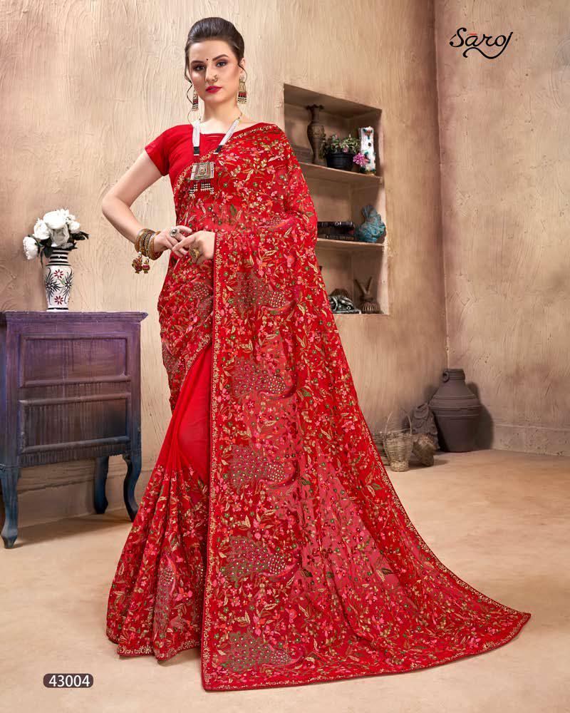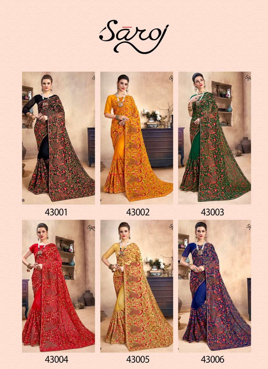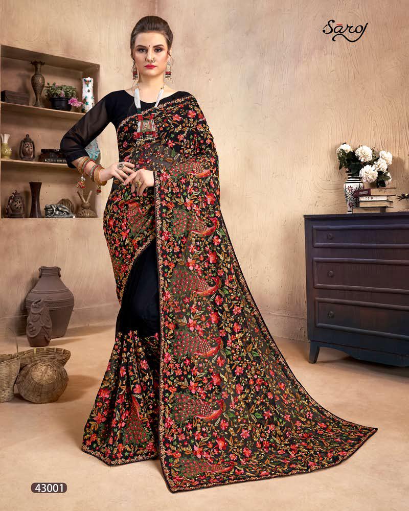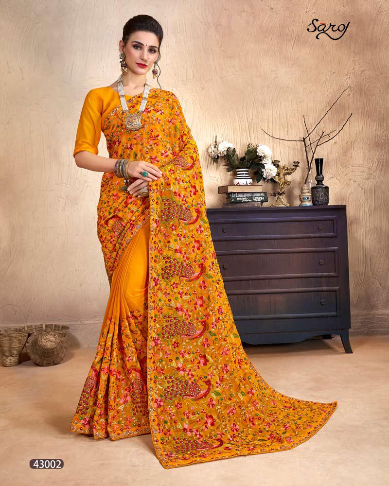 *Fashion World 2 by Saroj * Rate - 2525 per pcs . Set to set Fabric: 60gm. Georgette with very Heavy Kashmiri Work. Blouse: 60gm. Georgette. 6 Designs in set Delivery 2 days |