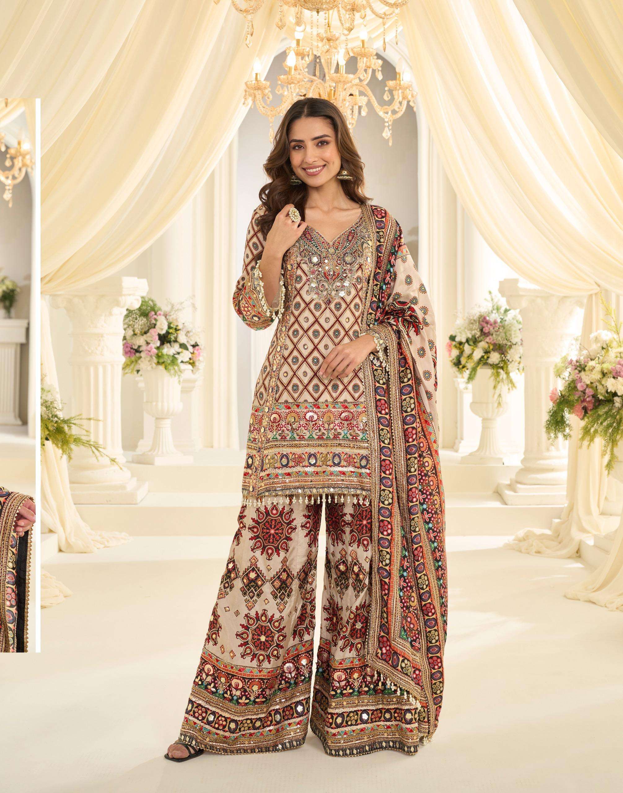 FABRIC - PREMIUM NATURAL CREP SILK ( LATEST TRENDY NATURAL CREP PRINTED TOP AND PLAZZO WITH HAND AARI WORK, EMBLLISHED GOTA PATTI AARI WORK ALL OVER DETALING WITH GOTA DUPATTA )