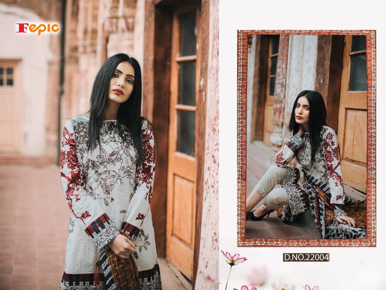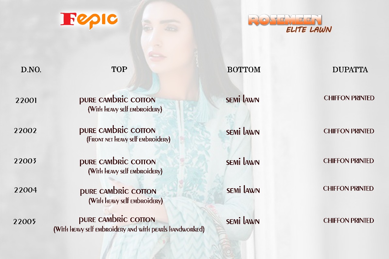 Buy Online Fepic Rosmeen Elit Lawn 22001 Series Pure Cambric Cotton Pakistani Suit Catlog Wholesale Dealer Surat 5 Pcs of Full Catalogue at Wholesale Price. Looking for Fepic Rosmeen Elit Lawn 22001 Series Pure Cambric Cotton Pakistani Suit Catlog Wholesale Dealer Surat Full Catalouge at Best Price? Buy Now Fepic Rosmeen Elit Lawn 22001 Series Pure Cambric Cotton Pakistani Suit Catlog Wholesale Dealer Surat at Wholesale Rate of Rs 4245 with Total 5 Pcs from authroized dealer and supplier of FEPIC Brand. Cost of Each piece is just only Rs 849 which is very low and affordable price to resale the product in your retail store ,This is Surat based Wholesale Supplier & Dealer of FEPIC Brand. Click on Brand name to Know more about FEPIC Brand's products.Call or Whatsapp on 9898838984 for booking or enquiry