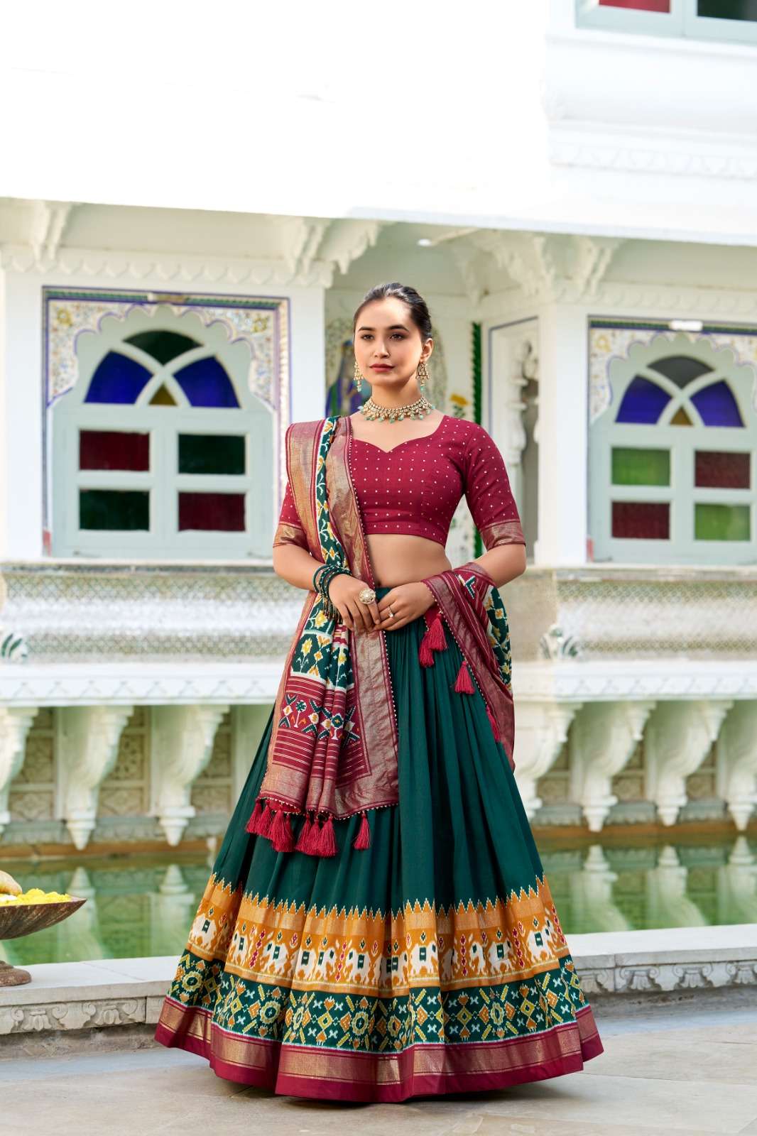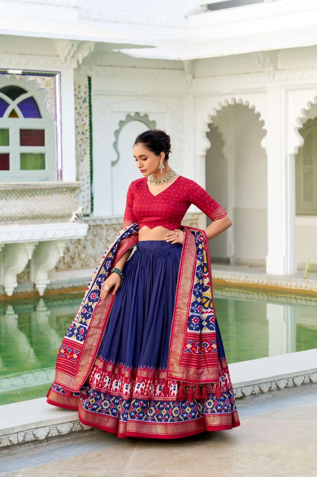 *Lehenga(Stitched)* Lehenga Fabric : Tussar Silk Lehenga Work : Patola Print With foil work Waist : SUPPORTED UP TO 42 Lehenga Closer : Drawstring With Heavy Tassels and Zip Stitching : Stitched With Canvas and attached with Can Can Length : 42 Flair : 3.80 Meter Inner : Micro Cotton