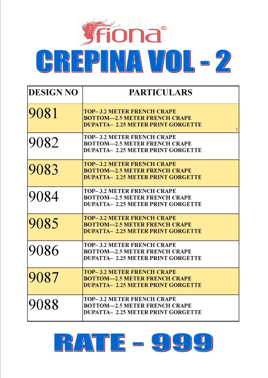 Fiona . Crepina Vol -2. Rate -999 per pcs . Set to set . GST 5 Percent Extra. Book your order |