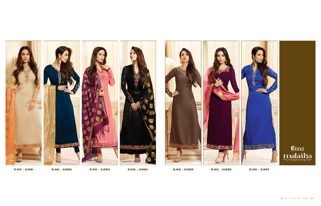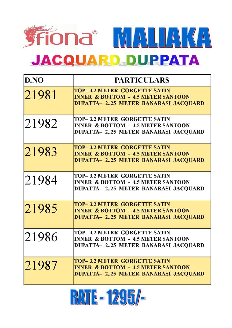Buy Online Fiona Malaika Jacquard Dupatta 21981 Series Designer Suit Collection Wholesale Dealer And Supplier Surat 7 Pcs of Full Catalogue at Wholesale Price. Looking for Fiona Malaika Jacquard Dupatta 21981 Series Designer Suit Collection Wholesale Dealer And Supplier Surat Full Catalouge at Best Price? Buy Now Fiona Malaika Jacquard Dupatta 21981 Series Designer Suit Collection Wholesale Dealer And Supplier Surat at Wholesale Rate of Rs 9065 with Total 7 Pcs from authroized dealer and supplier of FIONA Brand. Cost of Each piece is just only Rs 1295 which is very low and affordable price to resale the product in your retail store ,This is Surat based Wholesale Supplier & Dealer of FIONA Brand. Click on Brand name to Know more about FIONA Brand's products.Call or Whatsapp on 9898838984 for booking or enquiry