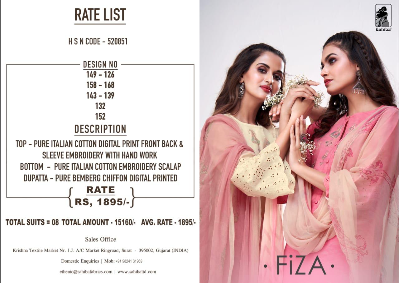 Buy Online Fiza By Sahiba Designer Suits Wholesale Suppliers And Dealer From India 8 Pcs of Full Catalogue at Wholesale Price. Looking for Fiza By Sahiba Designer Suits Wholesale Suppliers And Dealer From India Full Catalouge at Best Price? Buy Now Fiza By Sahiba Designer Suits Wholesale Suppliers And Dealer From India at Wholesale Rate of Rs 15160 with Total 8 Pcs from authroized dealer and supplier of Brand. Cost of Each piece is just only Rs 1895 which is very low and affordable price to resale the product in your retail store ,This is Surat based Wholesale Supplier & Dealer of Brand. Click on Brand name to Know more about Brand's products.Call or Whatsapp on 9898838984 for booking or enquiry