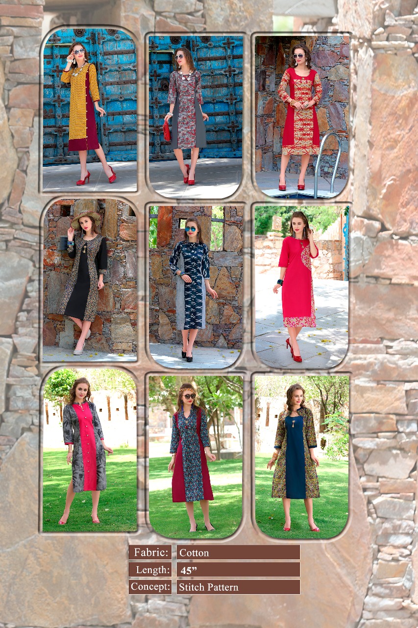Catalogue:- *FIZA* ?Cloth :- *HEAVY COTTON PRINT* ?Concept :- *STITCH PATTERN* Length :- *45Â? * MINIMUM Size:- *M L XL 2XL 3XL * AVAILABLE 8 DESIGNS CATALOGUE PRICE 390 Gst 5% |