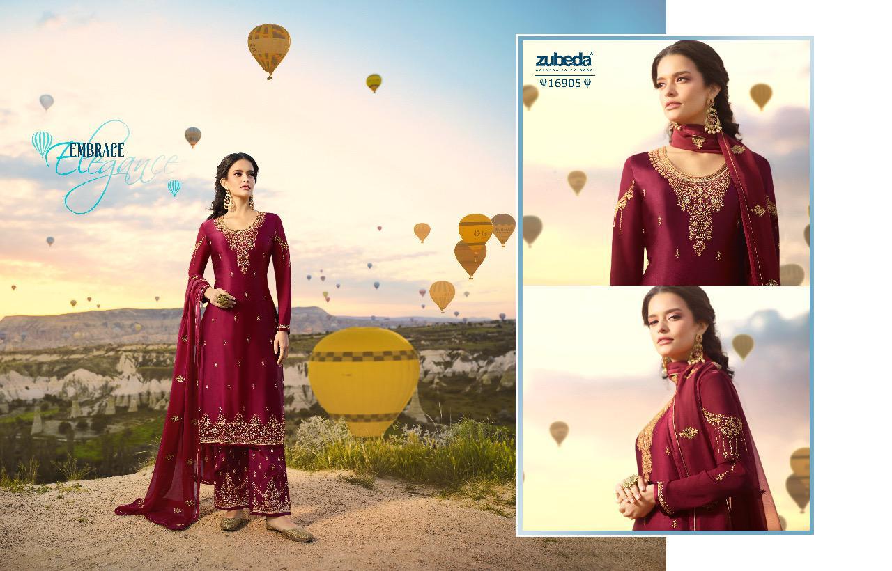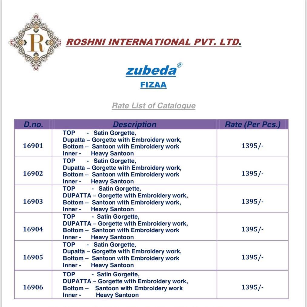 Buy Online Fizaa By Zubeda Series 16901 To 16906 Satin Georgette Embroidered Designer Party Wear Suits Wholesale Supplier Nd Trader Gujarat 6 Pcs of Full Catalogue at Wholesale Price. Looking for Fizaa By Zubeda Series 16901 To 16906 Satin Georgette Embroidered Designer Party Wear Suits Wholesale Supplier Nd Trader Gujarat Full Catalouge at Best Price? Buy Now Fizaa By Zubeda Series 16901 To 16906 Satin Georgette Embroidered Designer Party Wear Suits Wholesale Supplier Nd Trader Gujarat at Wholesale Rate of Rs 8370 with Total 6 Pcs from authroized dealer and supplier of ZUBEDA Brand. Cost of Each piece is just only Rs 1395 which is very low and affordable price to resale the product in your retail store ,This is Surat based Wholesale Supplier & Dealer of ZUBEDA Brand. Click on Brand name to Know more about ZUBEDA Brand's products.Call or Whatsapp on 9898838984 for booking or enquiry