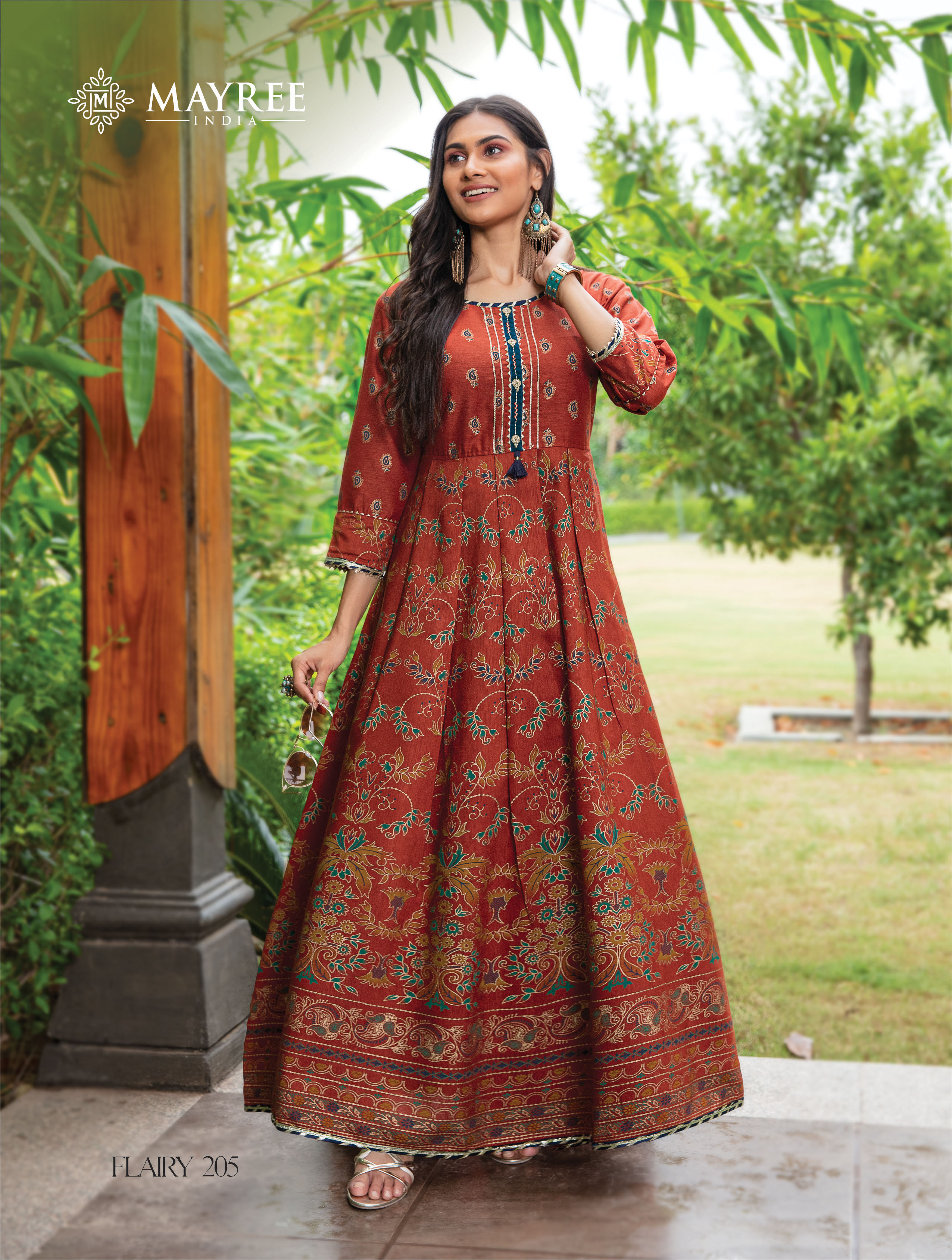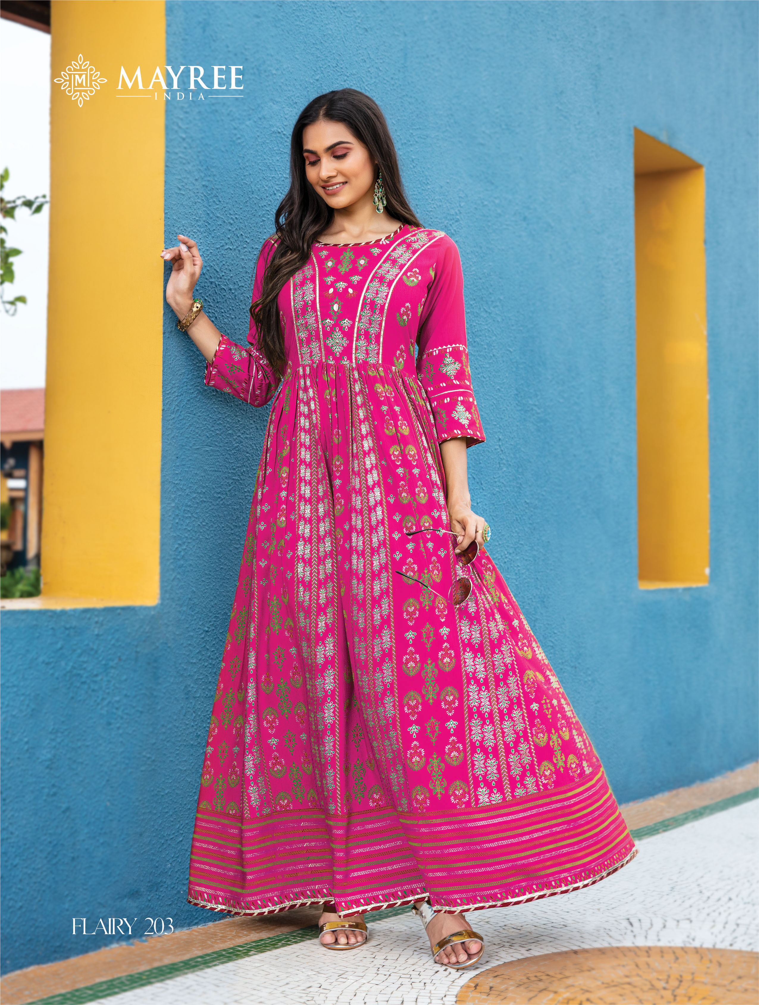 *? MAYREE-INDIA?* Catalogue Name- New series *?FLAIRY Vol.2?* ?Details *?TOP* :-Heavy Silk gold print long floor gown with manual work *?Size* :- M(19) L(20) XL(21) 2XL(22) 3xl(23) *?Designs* :- 6 pcs *Rate: 595* |