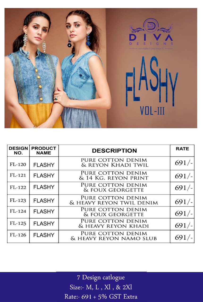 Buy Online Flashy Vol 3 By Diva 120 Series Fancy Deaigner Pure Cotton Denim Kurti Catlog Wholesaler Surat 7 Pcs of Full Catalogue at Wholesale Price. Looking for Flashy Vol 3 By Diva 120 Series Fancy Deaigner Pure Cotton Denim Kurti Catlog Wholesaler Surat Full Catalouge at Best Price? Buy Now Flashy Vol 3 By Diva 120 Series Fancy Deaigner Pure Cotton Denim Kurti Catlog Wholesaler Surat at Wholesale Rate of Rs 4837 with Total 7 Pcs from authroized dealer and supplier of BRAND'S Brand. Cost of Each piece is just only Rs 691 which is very low and affordable price to resale the product in your retail store ,This is Surat based Wholesale Supplier & Dealer of BRAND'S Brand. Click on Brand name to Know more about BRAND'S Brand's products.Call or Whatsapp on 9898838984 for booking or enquiry