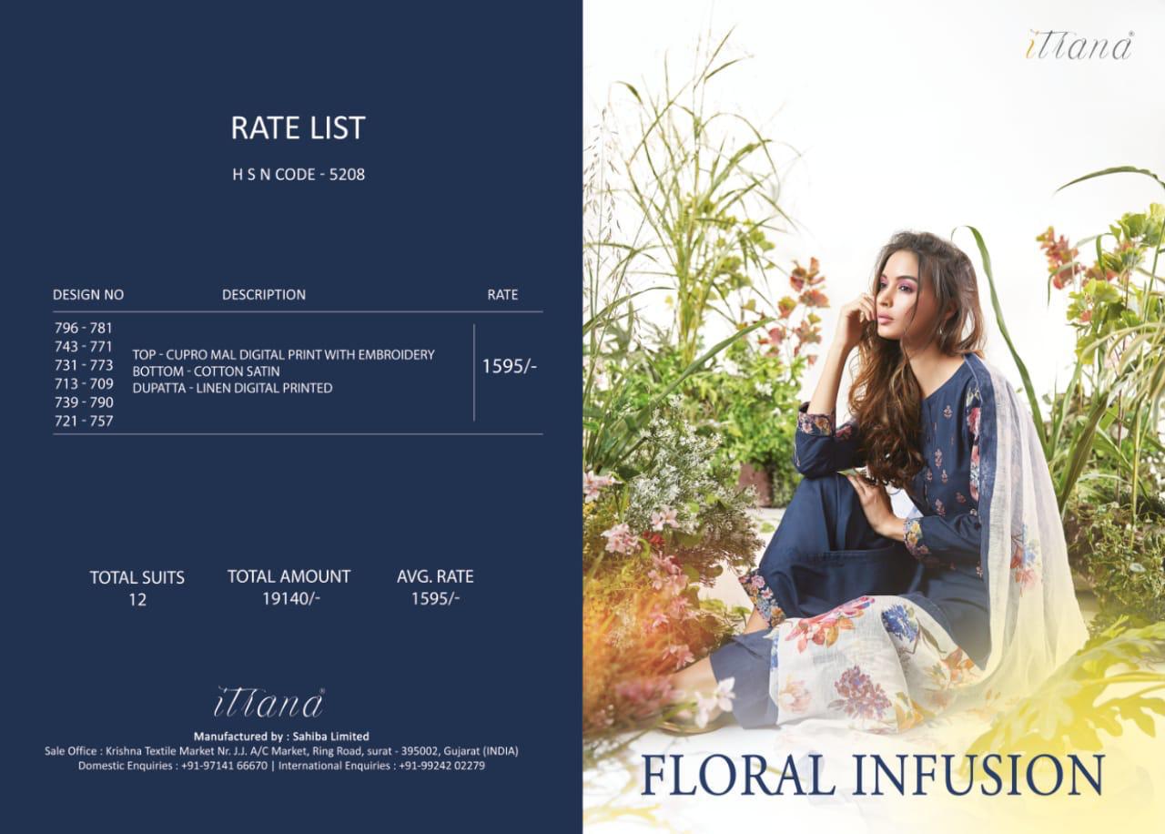 Buy Online Floral Infusion By Itrana Digital Printed Embroidered Designer Party Wear Suits Wholesale Supplier India 12 Pcs of Full Catalogue at Wholesale Price. Looking for Floral Infusion By Itrana Digital Printed Embroidered Designer Party Wear Suits Wholesale Supplier India Full Catalouge at Best Price? Buy Now Floral Infusion By Itrana Digital Printed Embroidered Designer Party Wear Suits Wholesale Supplier India at Wholesale Rate of Rs 19140 with Total 12 Pcs from authroized dealer and supplier of ITRANA Brand. Cost of Each piece is just only Rs 1595 which is very low and affordable price to resale the product in your retail store ,This is Surat based Wholesale Supplier & Dealer of ITRANA Brand. Click on Brand name to Know more about ITRANA Brand's products.Call or Whatsapp on 9898838984 for booking or enquiry