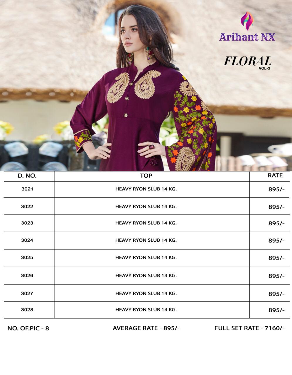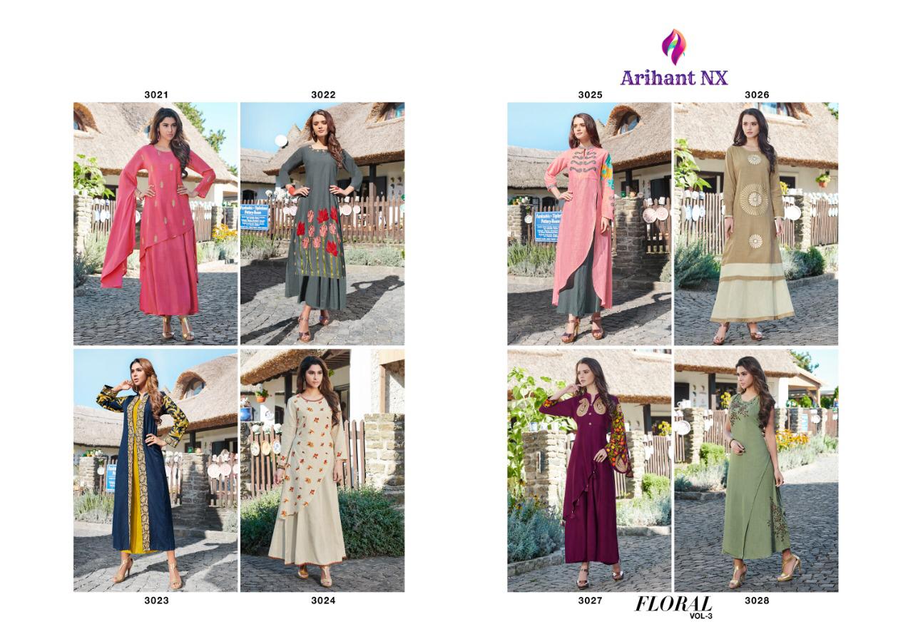 Buy Online Floral Vol 3 By Arihant Nx 3021 Series Fancy Party Wear Kurti Collection Wholesale Dealer Surat 8 Pcs of Full Catalogue at Wholesale Price. Looking for Floral Vol 3 By Arihant Nx 3021 Series Fancy Party Wear Kurti Collection Wholesale Dealer Surat Full Catalouge at Best Price? Buy Now Floral Vol 3 By Arihant Nx 3021 Series Fancy Party Wear Kurti Collection Wholesale Dealer Surat at Wholesale Rate of Rs 7160 with Total 8 Pcs from authroized dealer and supplier of ARIHANT NX Brand. Cost of Each piece is just only Rs 895 which is very low and affordable price to resale the product in your retail store ,This is Surat based Wholesale Supplier & Dealer of ARIHANT NX Brand. Click on Brand name to Know more about ARIHANT NX Brand's products.Call or Whatsapp on 9898838984 for booking or enquiry