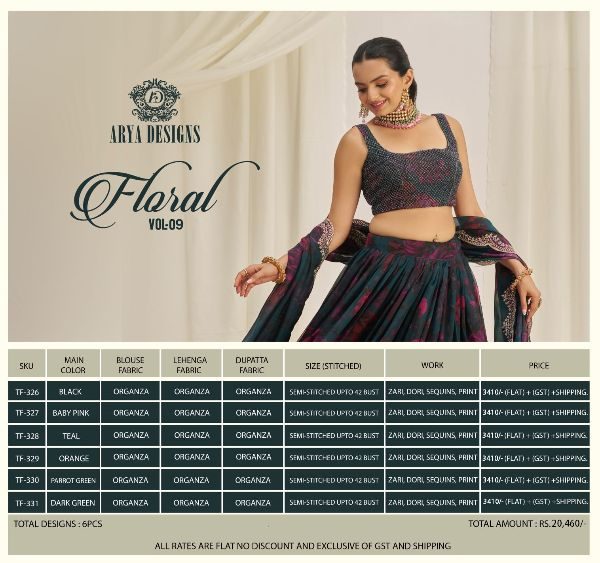 Buy Online Floral Vol 9 Series 326 To 331 By Arya Designs 6 Pcs of Full Catalogue at Wholesale Price. Looking for Floral Vol 9 Series 326 To 331 By Arya Designs Full Catalouge at Best Price? Buy Now Floral Vol 9 Series 326 To 331 By Arya Designs at Wholesale Rate of Rs 20460 with Total 6 Pcs from authroized dealer and supplier of Brand. Cost of Each piece is just only Rs 3410 which is very low and affordable price to resale the product in your retail store ,This is Surat based Wholesale Supplier & Dealer of Brand. Click on Brand name to Know more about Brand's products.Call or Whatsapp on 9898838984 for booking or enquiry