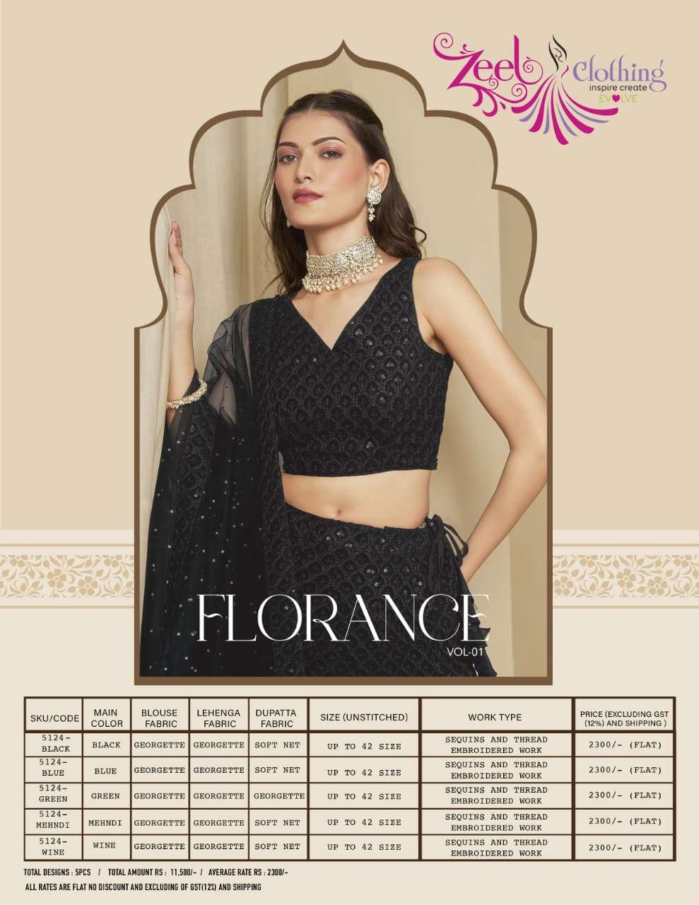 Buy Online Florance Vol 1 by Zeel Clothing lehenga collection manufacturer Surat 5 Pcs of Full Catalogue at Wholesale Price. Looking for Florance Vol 1 by Zeel Clothing lehenga collection manufacturer Surat Full Catalouge at Best Price? Buy Now Florance Vol 1 by Zeel Clothing lehenga collection manufacturer Surat at Wholesale Rate of Rs 11500 with Total 5 Pcs from authroized dealer and supplier of Zeel Clothing Brand. Cost of Each piece is just only Rs 2300 which is very low and affordable price to resale the product in your retail store ,This is Surat based Wholesale Supplier & Dealer of Zeel Clothing Brand. Click on Brand name to Know more about Zeel Clothing Brand's products.Call or Whatsapp on 9898838984 for booking or enquiry