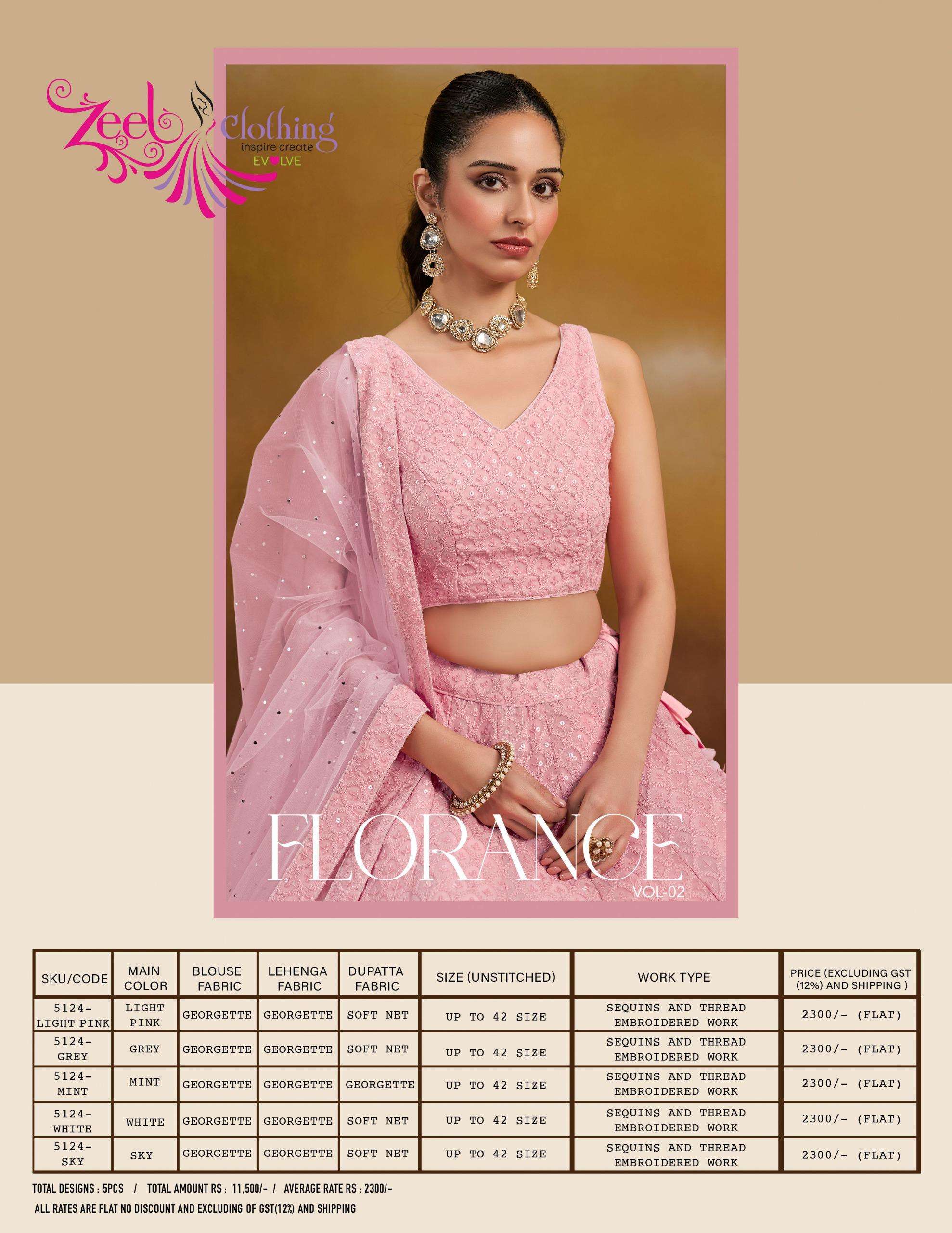 Buy Online Florance Vol 2 by Zeel Clothing Georgette lehenga choli collection manufacturer surat 5 Pcs of Full Catalogue at Wholesale Price. Looking for Florance Vol 2 by Zeel Clothing Georgette lehenga choli collection manufacturer surat Full Catalouge at Best Price? Buy Now Florance Vol 2 by Zeel Clothing Georgette lehenga choli collection manufacturer surat at Wholesale Rate of Rs 11500 with Total 5 Pcs from authroized dealer and supplier of Zeel Clothing Brand. Cost of Each piece is just only Rs 2300 which is very low and affordable price to resale the product in your retail store ,This is Surat based Wholesale Supplier & Dealer of Zeel Clothing Brand. Click on Brand name to Know more about Zeel Clothing Brand's products.Call or Whatsapp on 9898838984 for booking or enquiry
