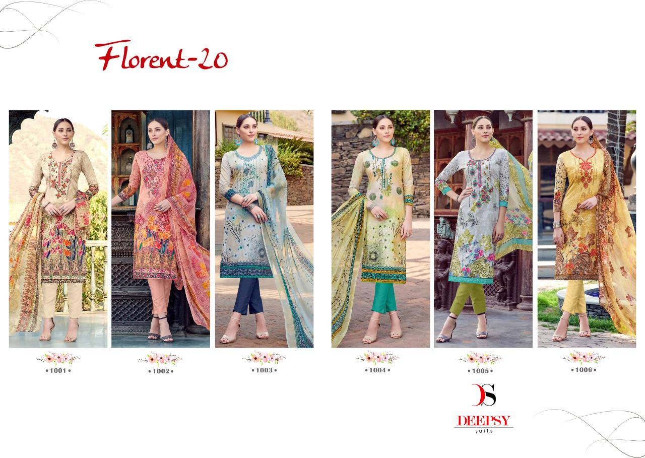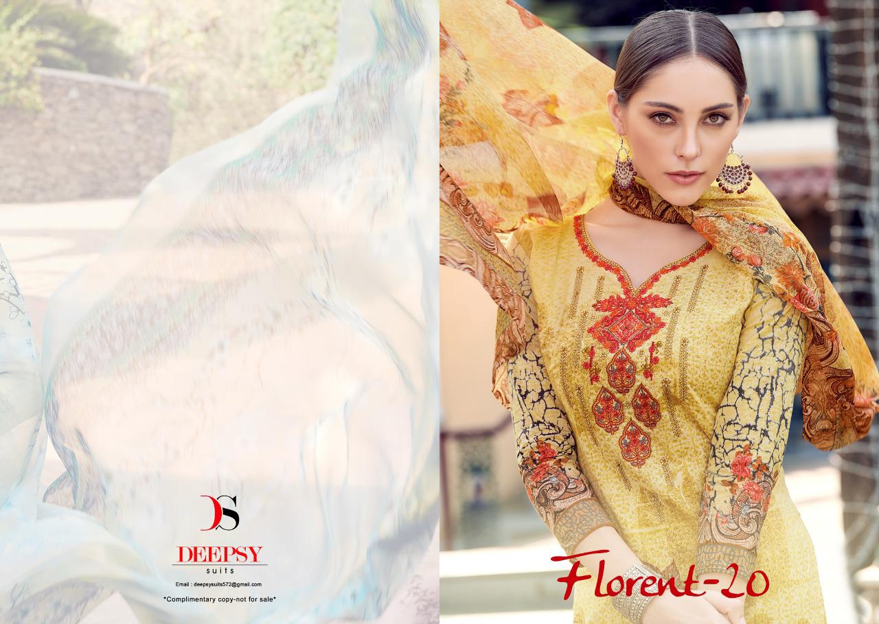 Buy Online Florent 20 By Deepsy Cotton Printed Self Embroidered Suit Wholesale Supplier And Dealer Surat 6 Pcs of Full Catalogue at Wholesale Price. Looking for Florent 20 By Deepsy Cotton Printed Self Embroidered Suit Wholesale Supplier And Dealer Surat Full Catalouge at Best Price? Buy Now Florent 20 By Deepsy Cotton Printed Self Embroidered Suit Wholesale Supplier And Dealer Surat at Wholesale Rate of Rs 3420 with Total 6 Pcs from authroized dealer and supplier of DEEPSY Brand. Cost of Each piece is just only Rs 570 which is very low and affordable price to resale the product in your retail store ,This is Surat based Wholesale Supplier & Dealer of DEEPSY Brand. Click on Brand name to Know more about DEEPSY Brand's products.Call or Whatsapp on 9898838984 for booking or enquiry