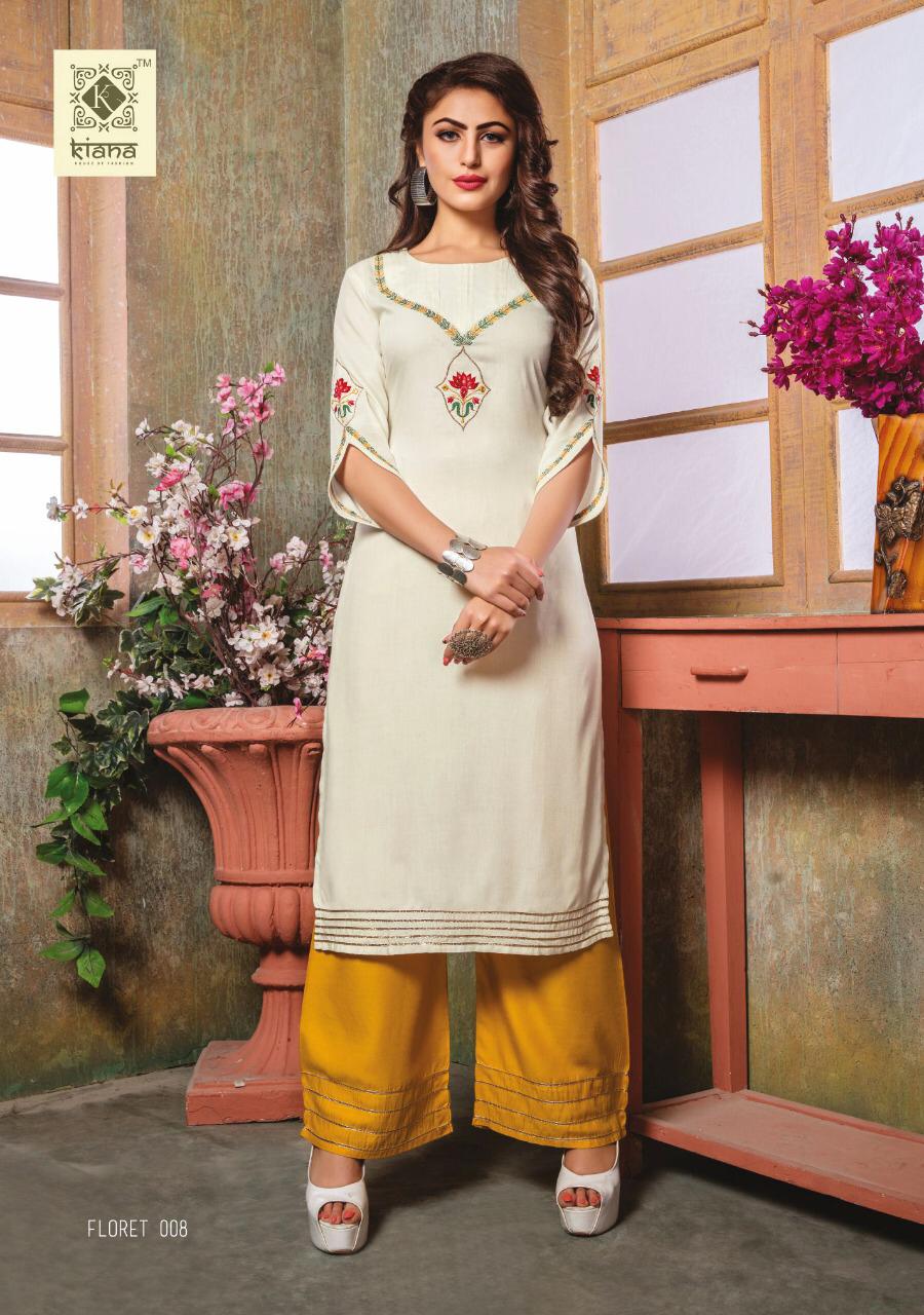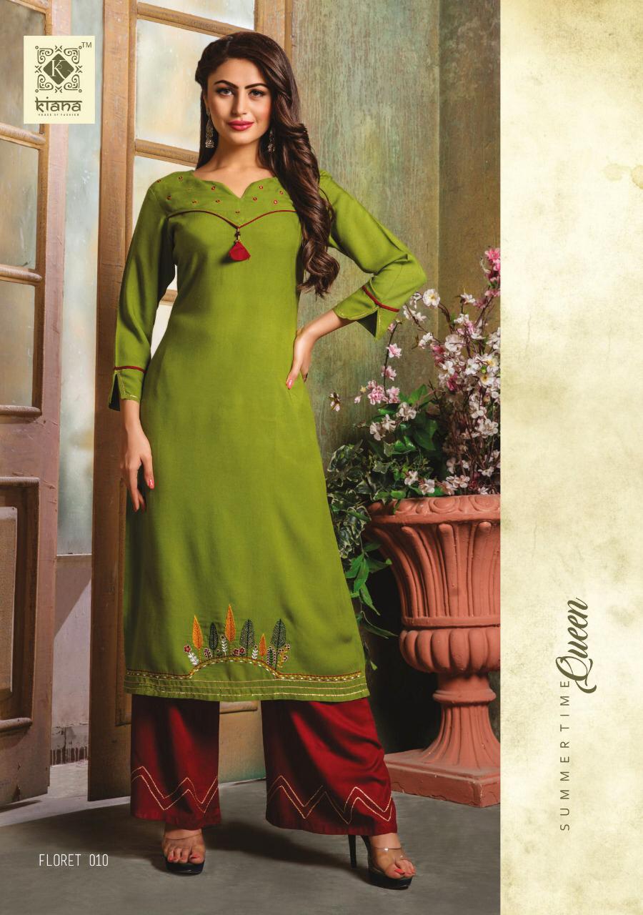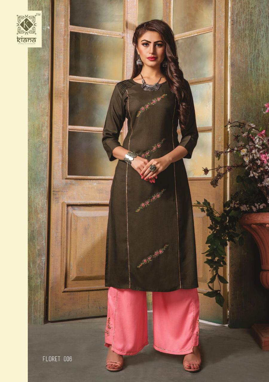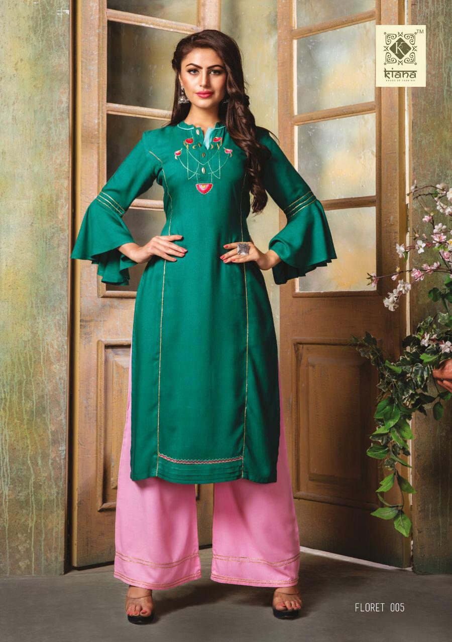 Buy Online Floret By Kiana House Of Fashion Reyon Designer Kurtis With Plazzo Wholesale Supplier Surat 10 Pcs of Full Catalogue at Wholesale Price. Looking for Floret By Kiana House Of Fashion Reyon Designer Kurtis With Plazzo Wholesale Supplier Surat Full Catalouge at Best Price? Buy Now Floret By Kiana House Of Fashion Reyon Designer Kurtis With Plazzo Wholesale Supplier Surat at Wholesale Rate of Rs 7000 with Total 10 Pcs from authroized dealer and supplier of KIANAA FASHION Brand. Cost of Each piece is just only Rs 700 which is very low and affordable price to resale the product in your retail store ,This is Surat based Wholesale Supplier & Dealer of KIANAA FASHION Brand. Click on Brand name to Know more about KIANAA FASHION Brand's products.Call or Whatsapp on 9898838984 for booking or enquiry
