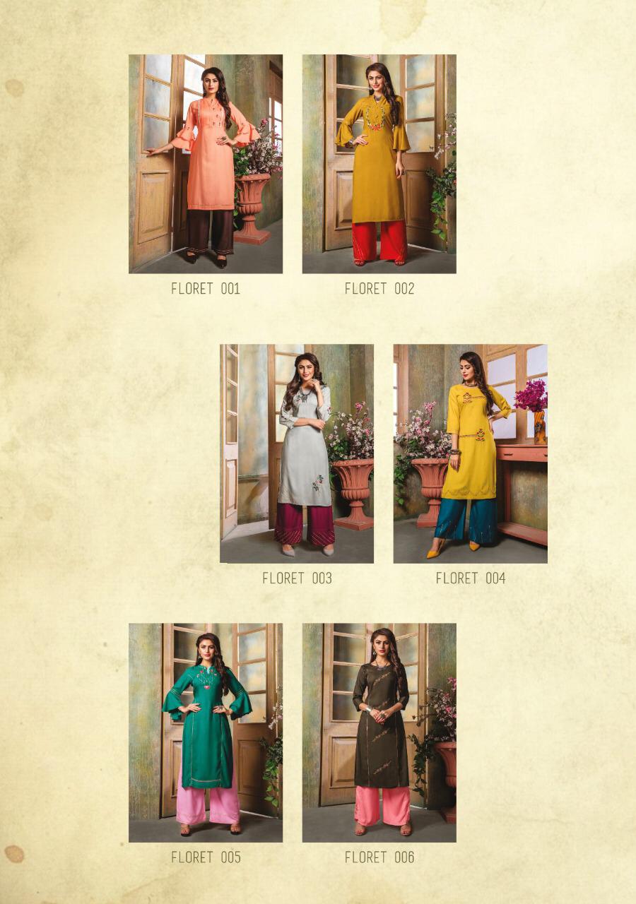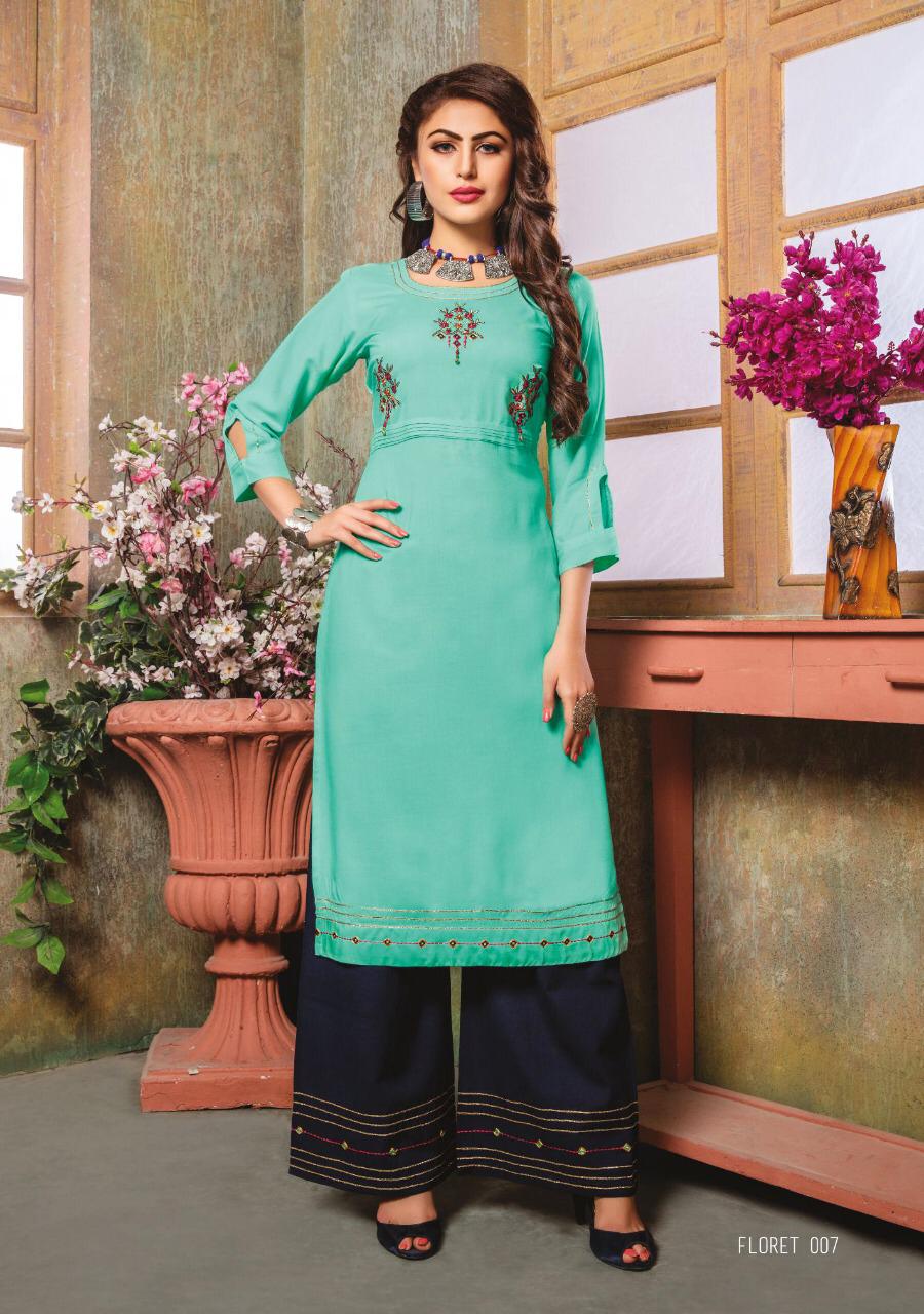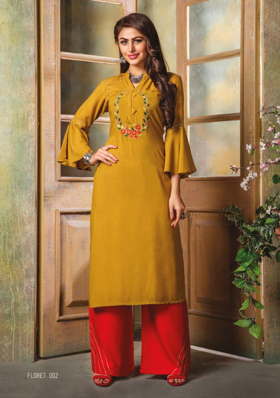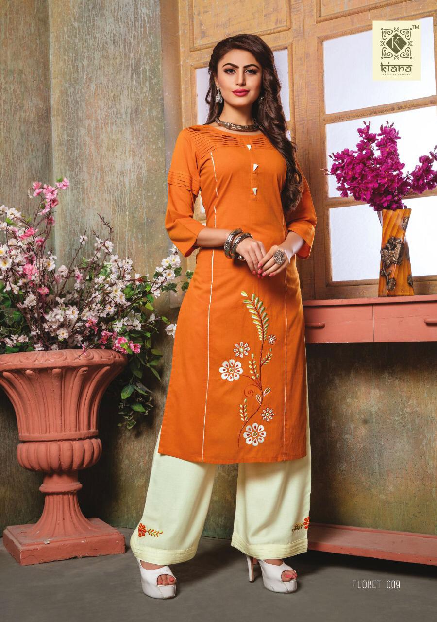 Buy Online Floret By Kiana House Of Fashion Reyon Designer Kurtis With Plazzo Wholesale Supplier Surat 10 Pcs of Full Catalogue at Wholesale Price. Looking for Floret By Kiana House Of Fashion Reyon Designer Kurtis With Plazzo Wholesale Supplier Surat Full Catalouge at Best Price? Buy Now Floret By Kiana House Of Fashion Reyon Designer Kurtis With Plazzo Wholesale Supplier Surat at Wholesale Rate of Rs 7000 with Total 10 Pcs from authroized dealer and supplier of KIANAA FASHION Brand. Cost of Each piece is just only Rs 700 which is very low and affordable price to resale the product in your retail store ,This is Surat based Wholesale Supplier & Dealer of KIANAA FASHION Brand. Click on Brand name to Know more about KIANAA FASHION Brand's products.Call or Whatsapp on 9898838984 for booking or enquiry