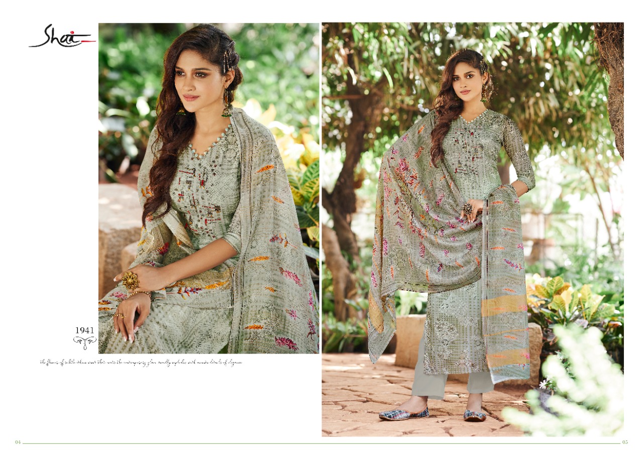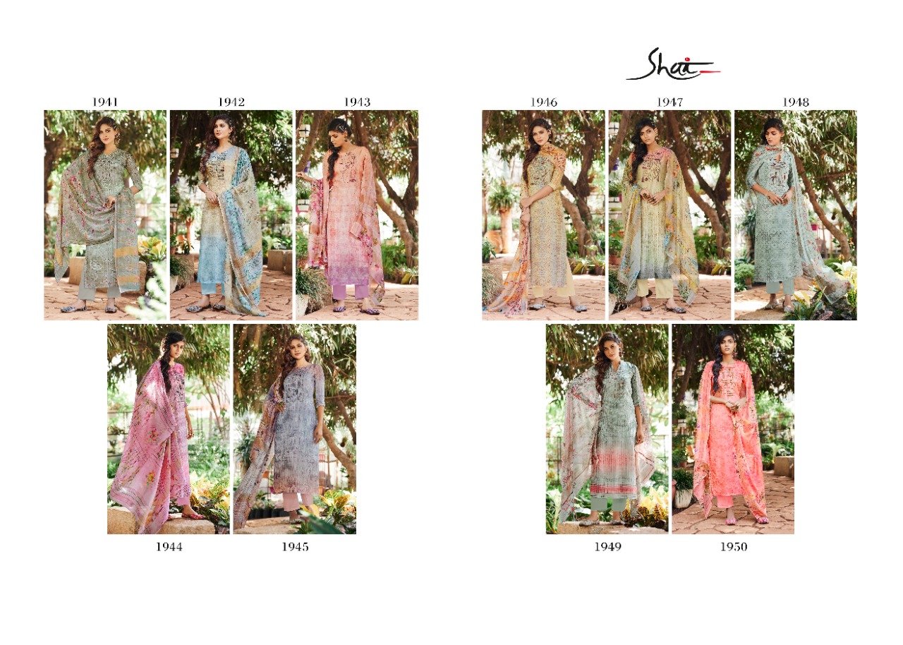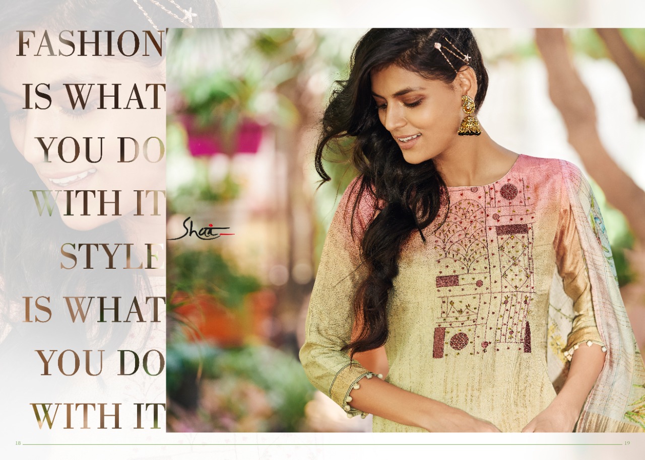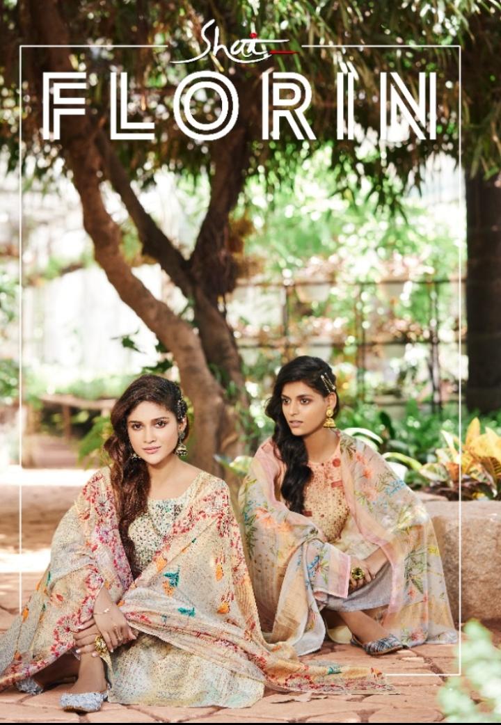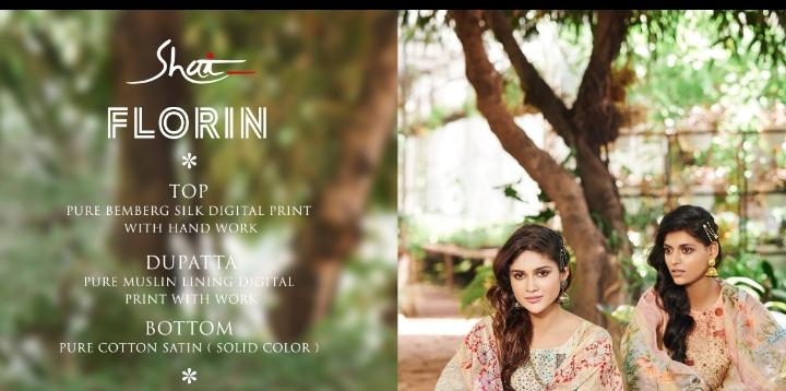 Brand - SHAI . Catlog name - FLORIN . 10 Designs Singal Colour Fabric Details Top = Pure Bemberg Silk Digital Print With Hand Work Bottom = Pure Cotton Satin(Solid Color) Dupatta = Pure Muslin lining Digital Print With Work Total pieces = 10 Rate = 1575/- Delivery 6-7 days . Set To Set . GST 5 Percent Extra. |