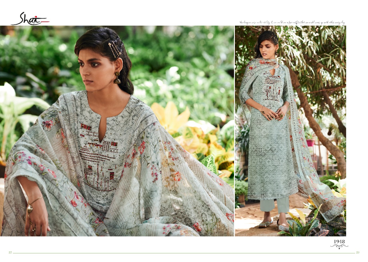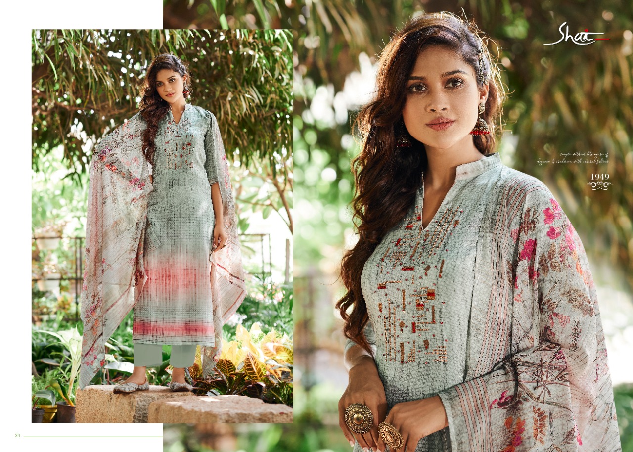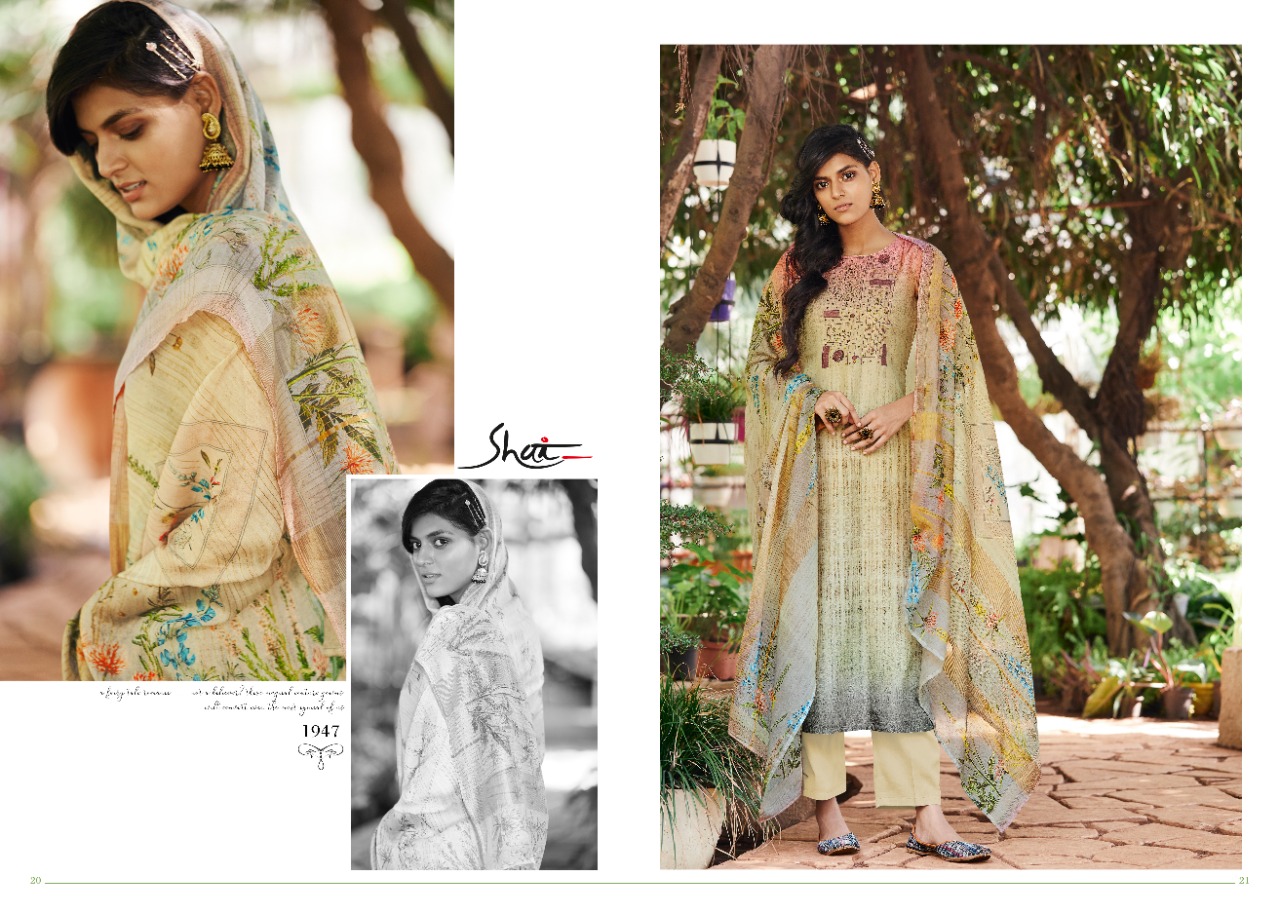 Brand - SHAI . Catlog name - FLORIN . 10 Designs Singal Colour Fabric Details Top = Pure Bemberg Silk Digital Print With Hand Work Bottom = Pure Cotton Satin(Solid Color) Dupatta = Pure Muslin lining Digital Print With Work Total pieces = 10 Rate = 1575/- Delivery 6-7 days . Set To Set . GST 5 Percent Extra. |