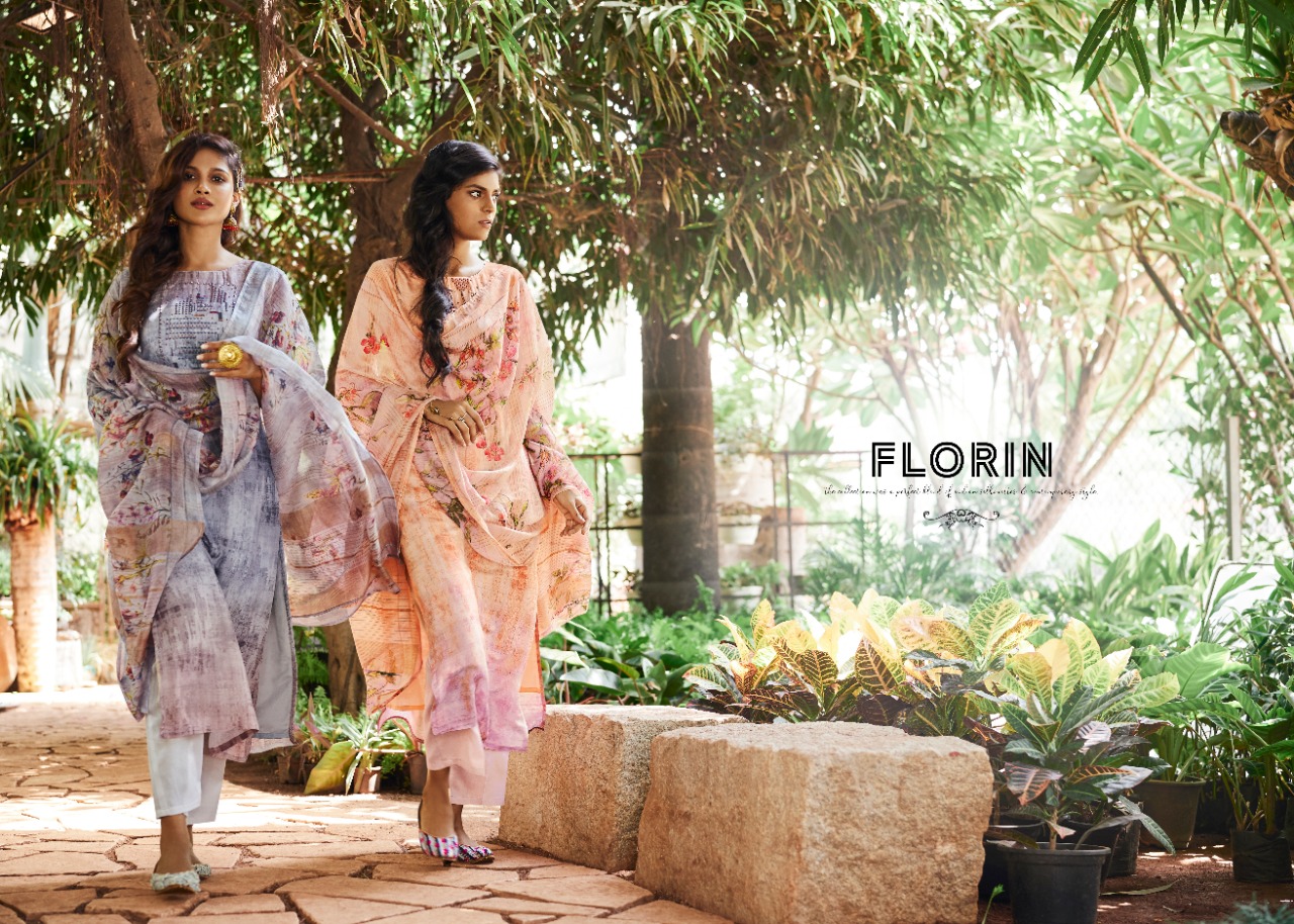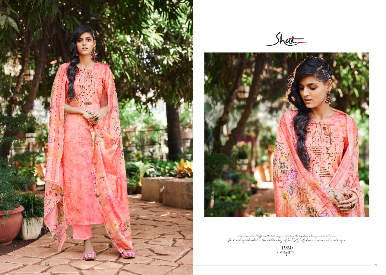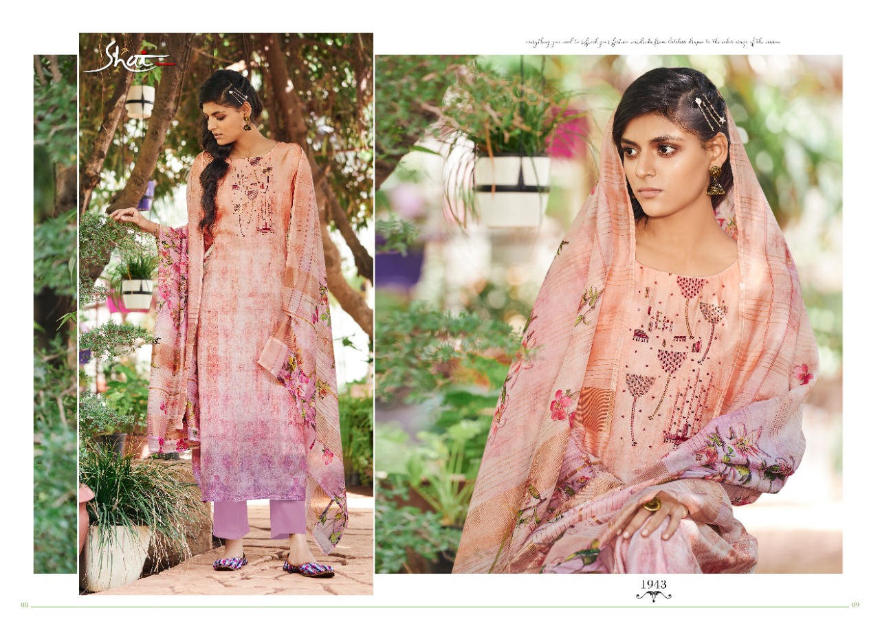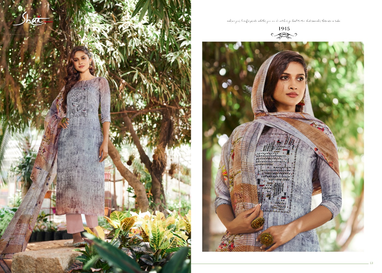 Brand - SHAI . Catlog name - FLORIN . 10 Designs Singal Colour Fabric Details Top = Pure Bemberg Silk Digital Print With Hand Work Bottom = Pure Cotton Satin(Solid Color) Dupatta = Pure Muslin lining Digital Print With Work Total pieces = 10 Rate = 1575/- Delivery 6-7 days . Set To Set . GST 5 Percent Extra. |
