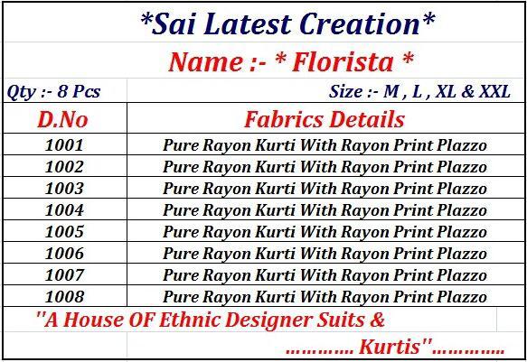Buy Online Florista By Slc Reyon Kurtis With Plazzo Wholesale Supplier Surat 8 Pcs of Full Catalogue at Wholesale Price. Looking for Florista By Slc Reyon Kurtis With Plazzo Wholesale Supplier Surat Full Catalouge at Best Price? Buy Now Florista By Slc Reyon Kurtis With Plazzo Wholesale Supplier Surat at Wholesale Rate of Rs 5400 with Total 8 Pcs from authroized dealer and supplier of Brand. Cost of Each piece is just only Rs 675 which is very low and affordable price to resale the product in your retail store ,This is Surat based Wholesale Supplier & Dealer of Brand. Click on Brand name to Know more about Brand's products.Call or Whatsapp on 9898838984 for booking or enquiry
