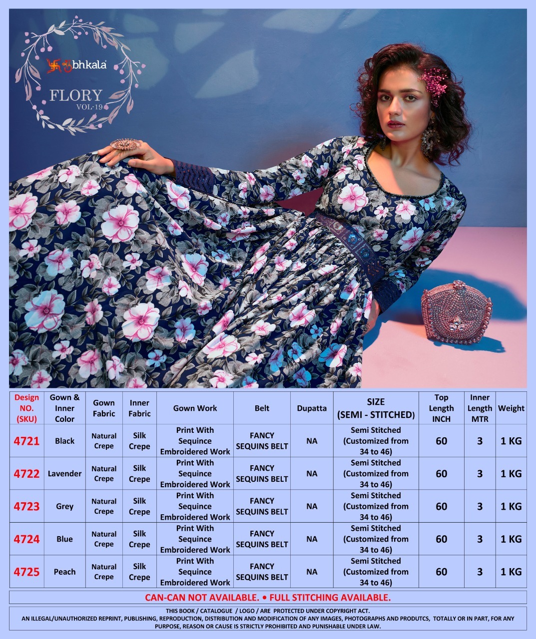 Buy Online Flory Vol 19 By Shubhkala Exclusive Printed Long Anarkali Gown Collection 5 Pcs of Full Catalogue at Wholesale Price. Looking for Flory Vol 19 By Shubhkala Exclusive Printed Long Anarkali Gown Collection Full Catalouge at Best Price? Buy Now Flory Vol 19 By Shubhkala Exclusive Printed Long Anarkali Gown Collection at Wholesale Rate of Rs 6500 with Total 5 Pcs from authroized dealer and supplier of Brand. Cost of Each piece is just only Rs 1300 which is very low and affordable price to resale the product in your retail store ,This is Surat based Wholesale Supplier & Dealer of Brand. Click on Brand name to Know more about Brand's products.Call or Whatsapp on 9898838984 for booking or enquiry